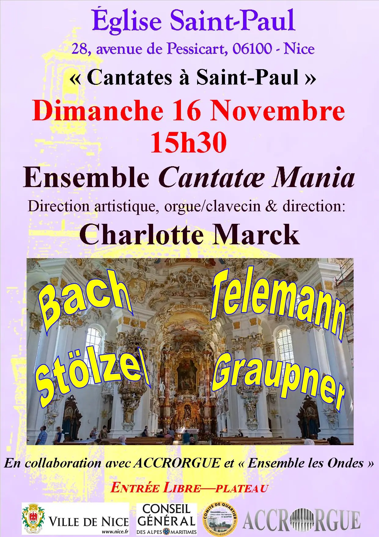 Initiées en 2024 par Charlotte Marck, professeur de clavecin au CRR de Nice, qui en est la directrice artistique, le cycle Cantates à Saint Paul a permit la découverte d'oeuvres vocales du répertoire baroque allemand peu jouées sous nos latitudes !