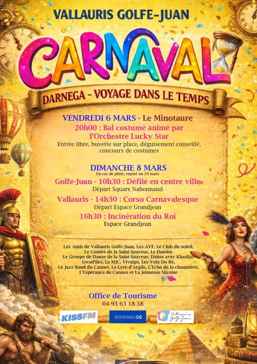 Venez célébrer le Carnaval de Darnega, "Voyage dans le temps", le dimanche 8 mars 2026 à Vallauris Golfe-Juan. Un événement festif avec défilés, musique et couleurs. En cas de pluie, il sera reporté au 29 mars 2026.