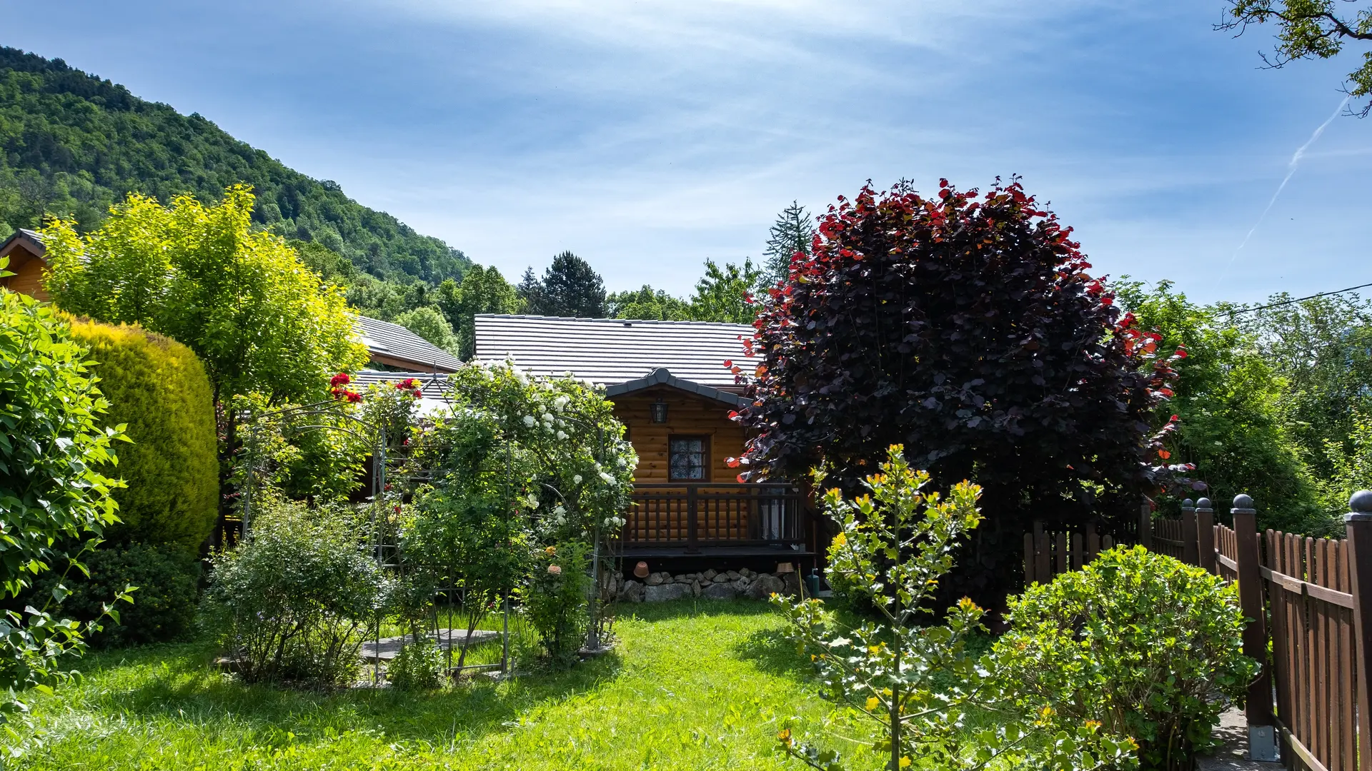 Ce chalet indépendant est doté de tout le confort : d'un séjour, d'une cuisine ouverte, d'une salle à manger, d'une salle de bain avec WC, d'une buanderie avec WC, d'une grande chambre, d'un parking fermé également mis à disposition. Un chalet tout confort et 100% détente également, puisqu'il y a deux terrasses et un jardin privatif de 100 m², un bassin aquatique.