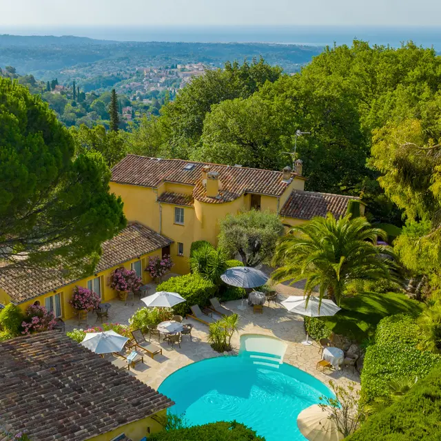 Perchée à 450 m d'altitude sur une colline dominant la vallée vençoise jusqu'à la mer (vue panoramique de chaque chambre), la Bastide provençale datant de 200 ans est posée au cœur de 2500 m² de jardins entourant la piscine et sa vaste terrasse. Calme et détente assurés. Espaces privatifs. Environnement pleine nature. Idéalement situé ente Cannes et Monaco dans l'arrière-pays Niçois