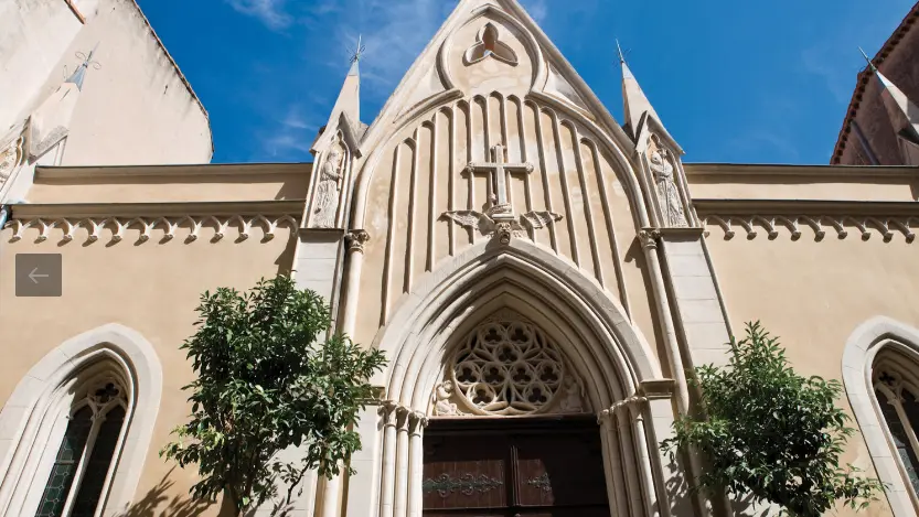 A l'extérieur, la façade située rue Rostan, est de style néo-gothique. Elle est couronnée de pinacles supportant sur les côtés les silhouettes de pénitents blancs recouverts de leur cagoule.