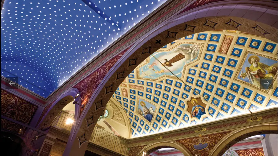 A l'intérieur, trois statues représentent Saint Roch, Saint Sébastien et Saint Bernardin de Sienne. Sur les côtés, le plafond est bleu outre-mer étoilé. Vous pouvez aussi admirer des fresques du XVIe siècle qui représentent la table des Apôtres. L'autel est orné de quatre colonnes torsadées en bois doré de style baroque décorées de feuilles d'acanthe.