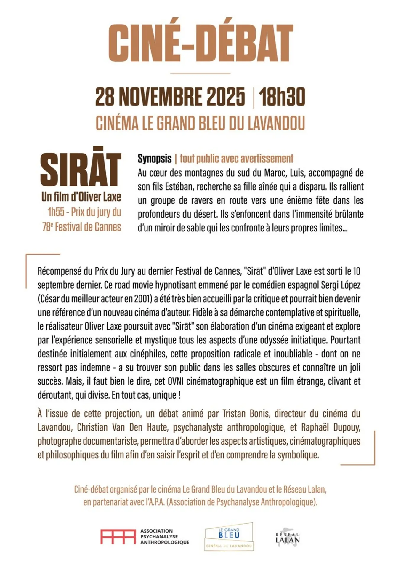 Le cinéma Le Grand Bleu du Lavandou et le Réseau Lalan, en partenariat avec l’A.P.A. (Association de Psychanalyse Anthropologique), vous invitent à un ciné-débat autour du film "Sirāt" d'Óliver Laxe.