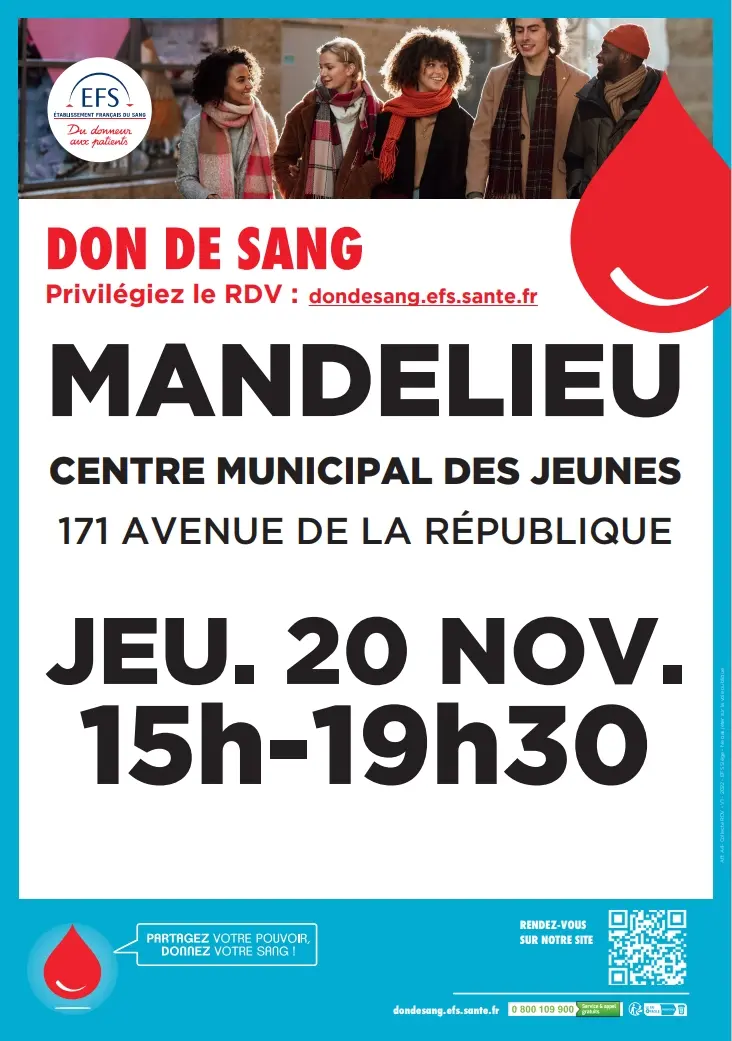 Gardez le rythme du don de sang cet automne et participez à la prochaine collecte organisée par l’EFS le JEUDI 20 NOVEMBRE de 15h à 19h30 à MANDELIEU au sein du CENTRE MUNICIPAL DES JEUNES - 171 AVENUE DE LA RÉPUBLIQUE. Pour vous faciliter la vie, réservez créneau de don dès maintenant : https://efs.link/in3JZ