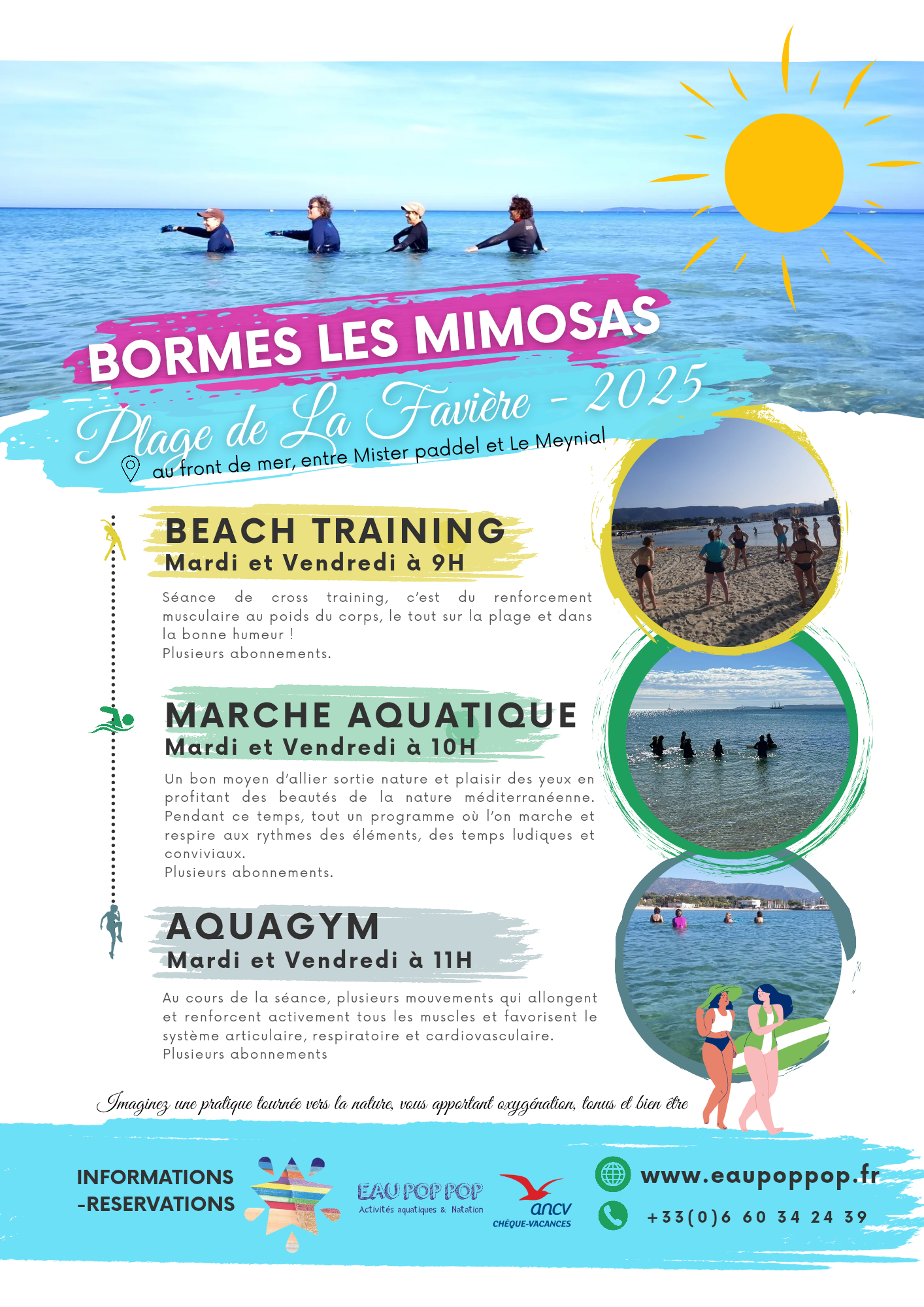 Tous les mardis sur la plage de La Favière, Yoga-Pilates, Aguagym-longe côte ou coaching privé pour tous de manière ludique dans un environnement de rêve. Séances adaptées à vos besoins.