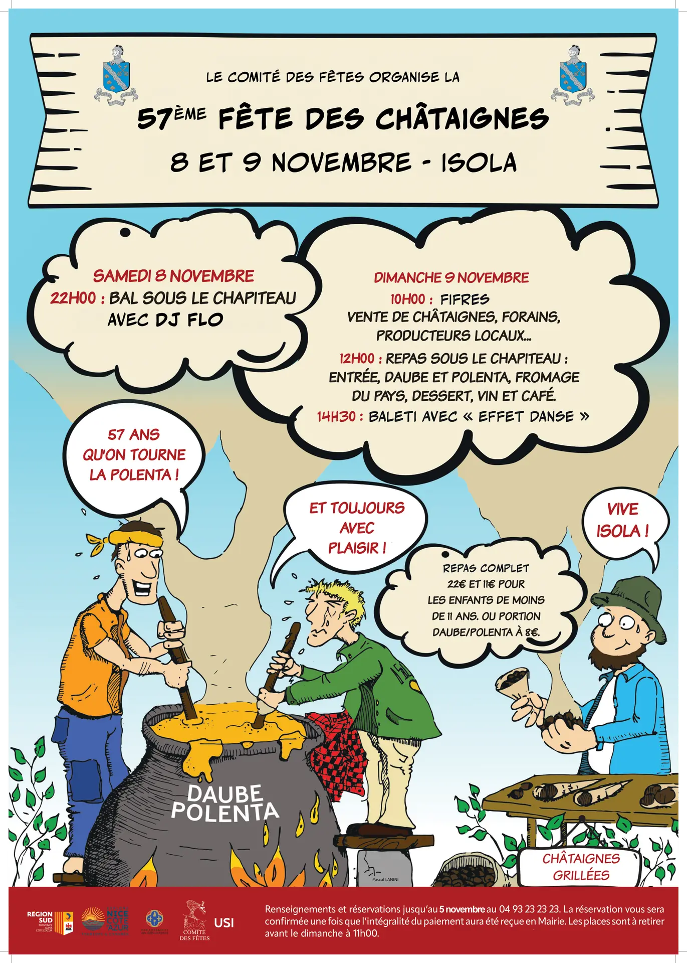 Au programme animations folkloriques, daube polenta, dégustation de châtaigne, marché de producteurs, forains et bal sous le chapiteau. Les réservations de repas se font en appelant la mairie. La réservation vous sera confirmée une fois que le montant sera réglé. ( A savoir que le samedi il y aura une permanence à l'office du tourisme ou devant la Mairie pour les gens qui souhaitent venir récupérer leurs tickets).