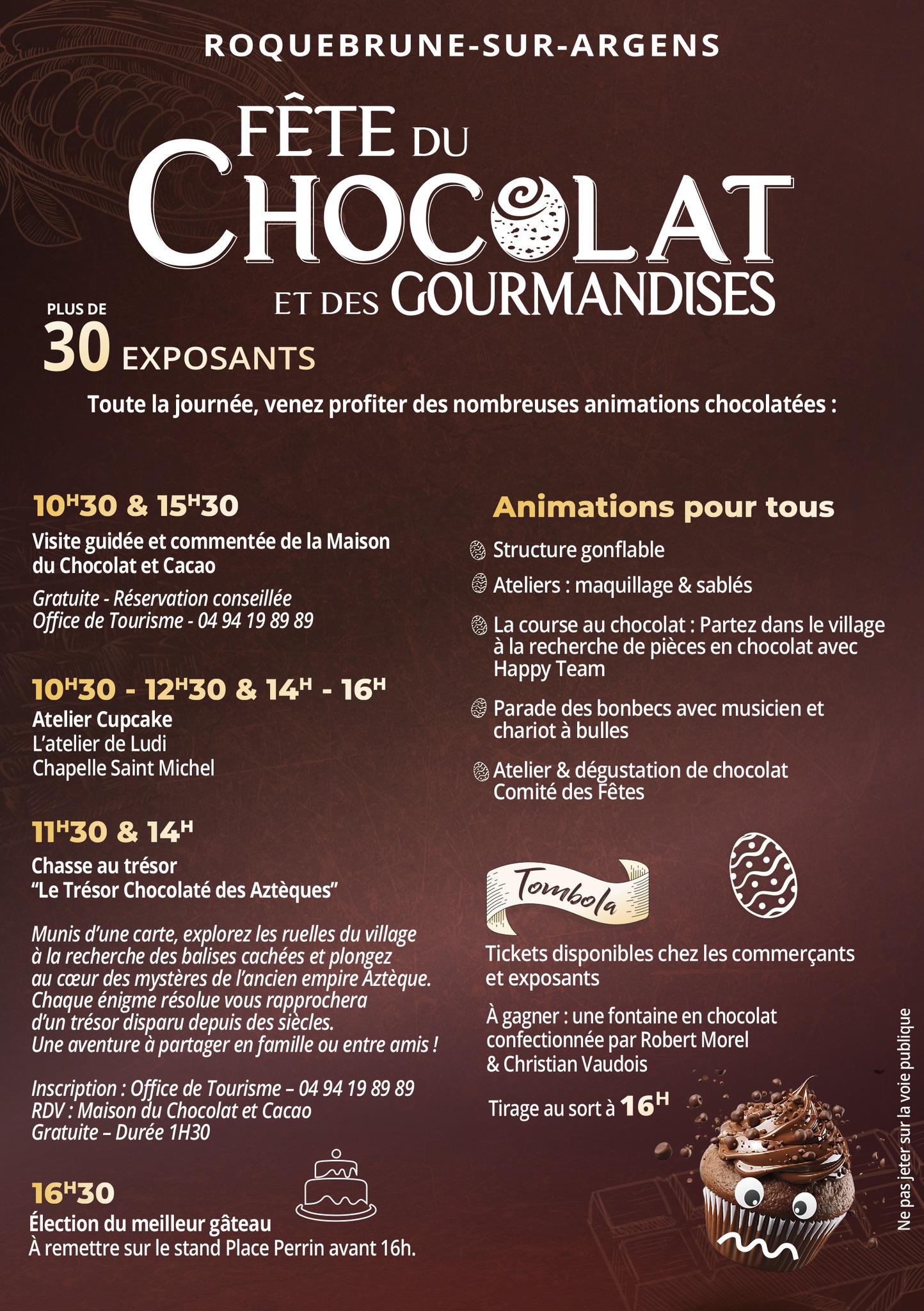 > A 11h30 et 14h : Carte en main, le chrono est lancé pour une aventure palpitante en famille ou entre amis avec la chasse au trésor chocolaté "Le Trésor Chocolaté des Aztèques ». De ruelles secrètes en places provençales, les énigmes sur l'ancien empire aztèque sont dissimulées sur le parcours.