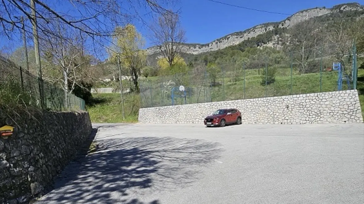 Parking et borne de recharge pour véhicule électrique à la sortie du village