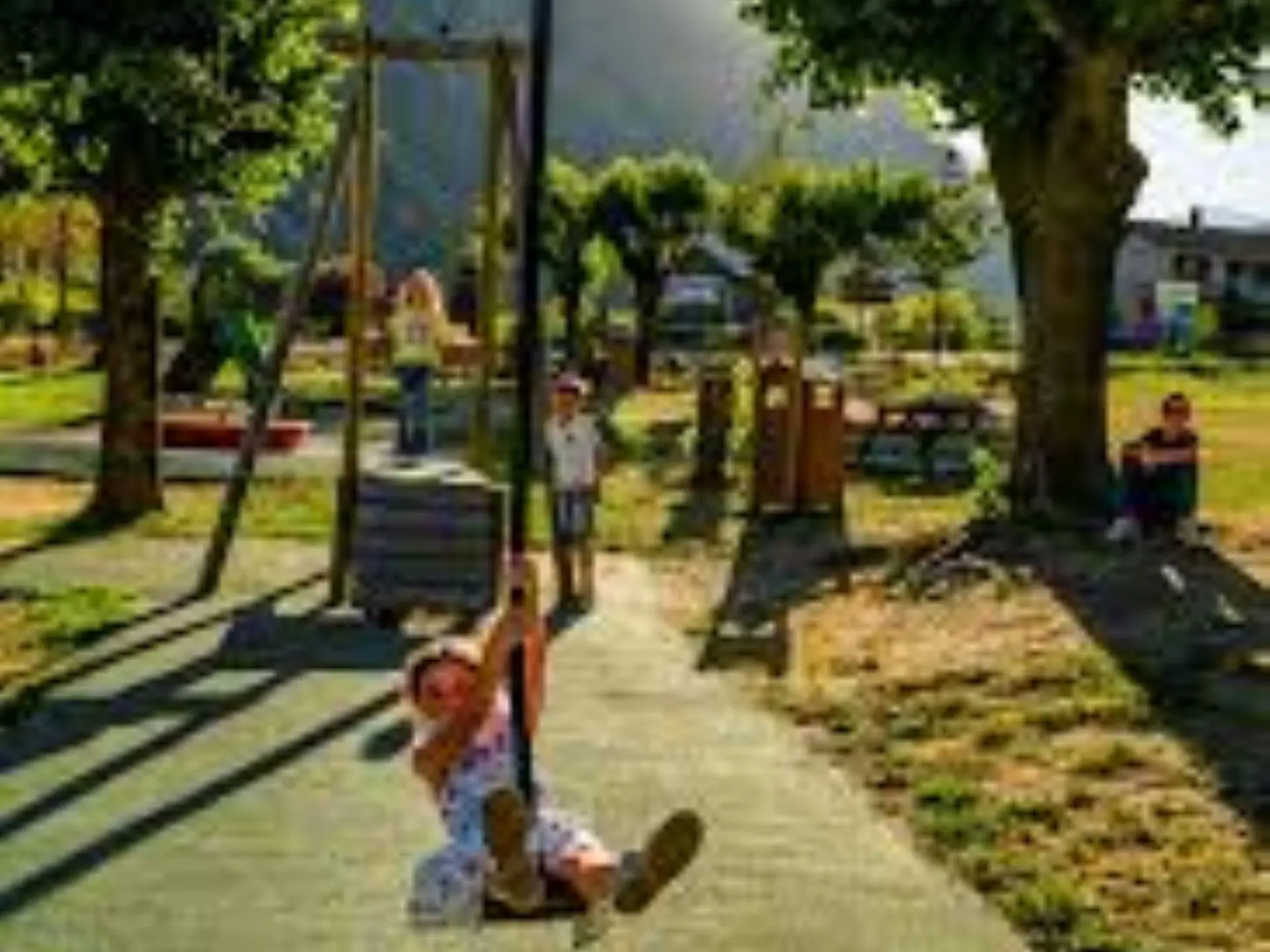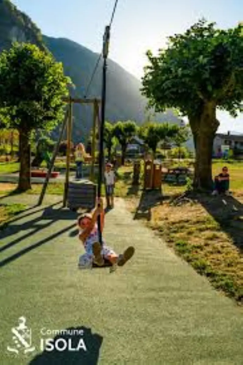 Jardin d'enfants avec tyrolienne, toboggans, balançoires, tourniquet et parcours sportif...