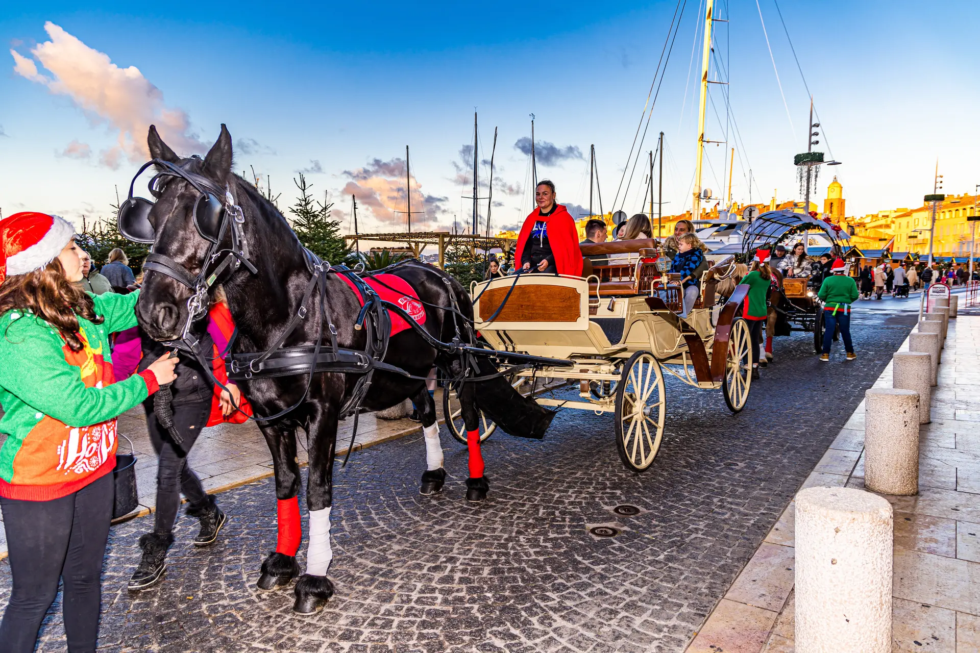 Des promenades en calèches sont proposées à celles et ceux qui souhaitent se laisser transporter par la magie de Noël dans les rues tropéziennes, de 14h à 18h.