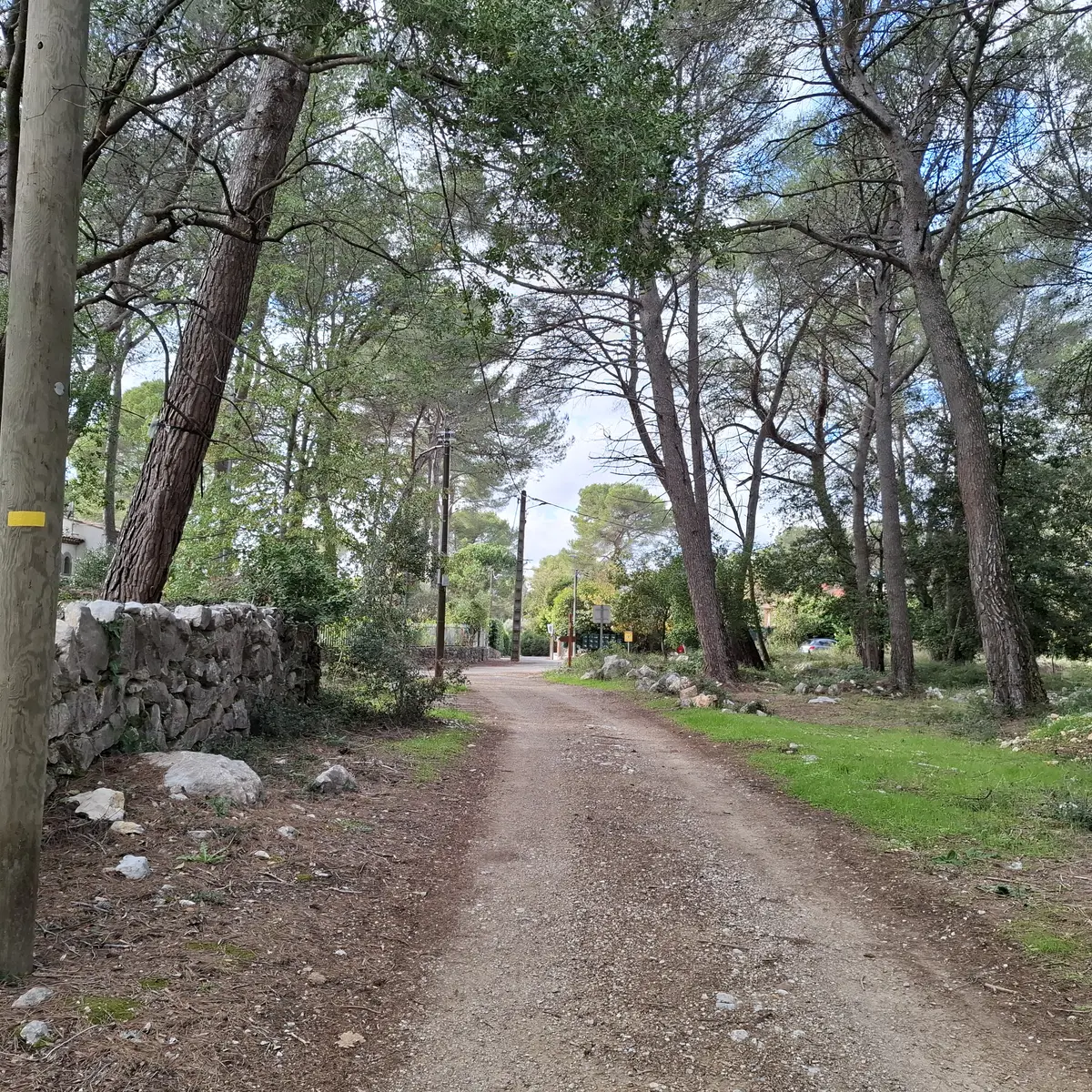 À la b.251 prendre direction les Terres Blanches (chemin du Camouyer). Tourner à gauche sur le chemin des Bertrands (b.259) et longer les restanques d’oliviers. Au plus haut du chemin, suivre le balisage jaune sur le poteau électrique, pour remonter un chemin boisé jusqu’à la piste du Débram (b.260) et tourner à gauche.