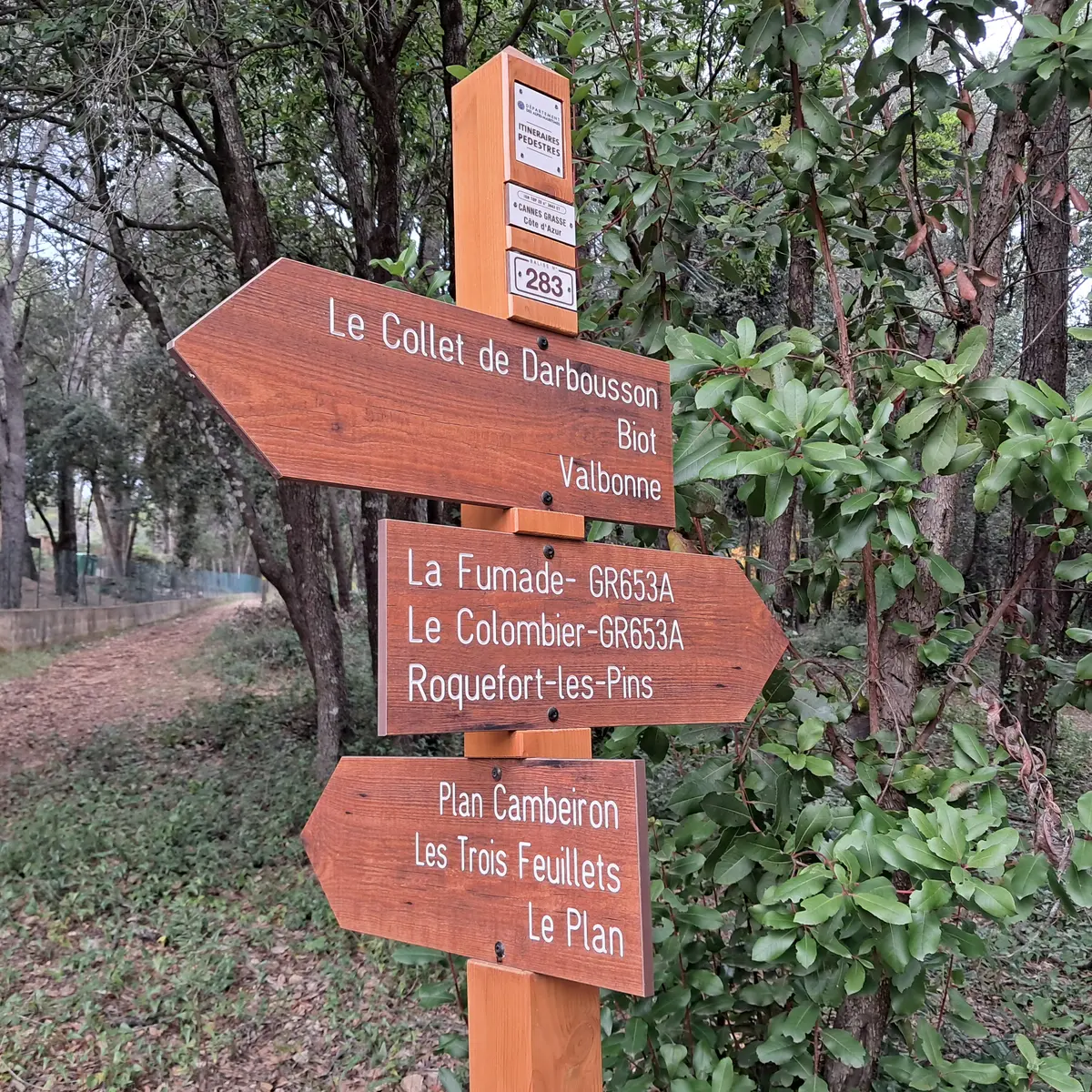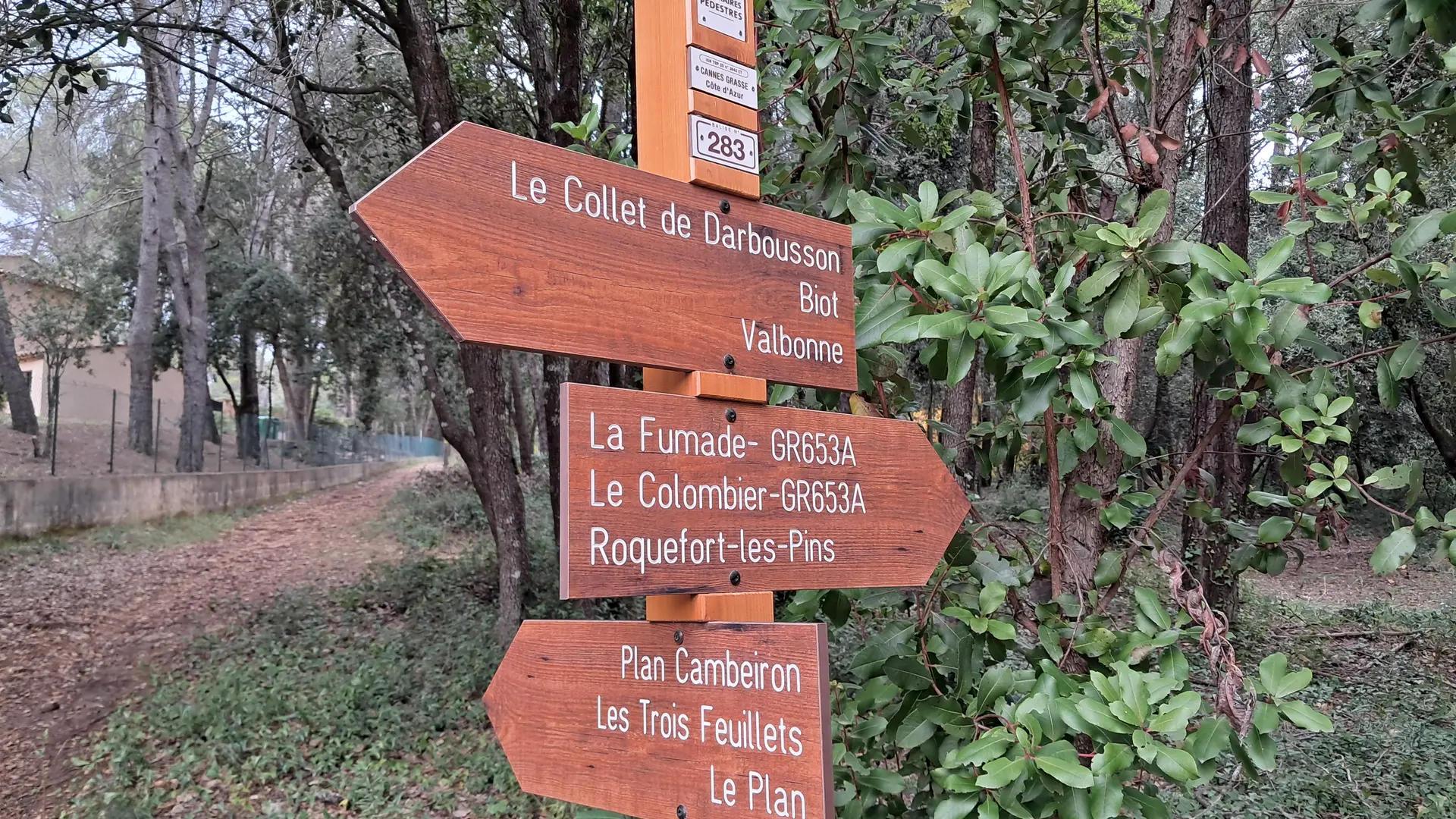 Cette boucle, sur le territoire de Roquefort-les-Pins via Valbonne, traverse des zones résidentielles, suit une section du GR653A et emprunte ensuite plusieurs pistes forestières.
