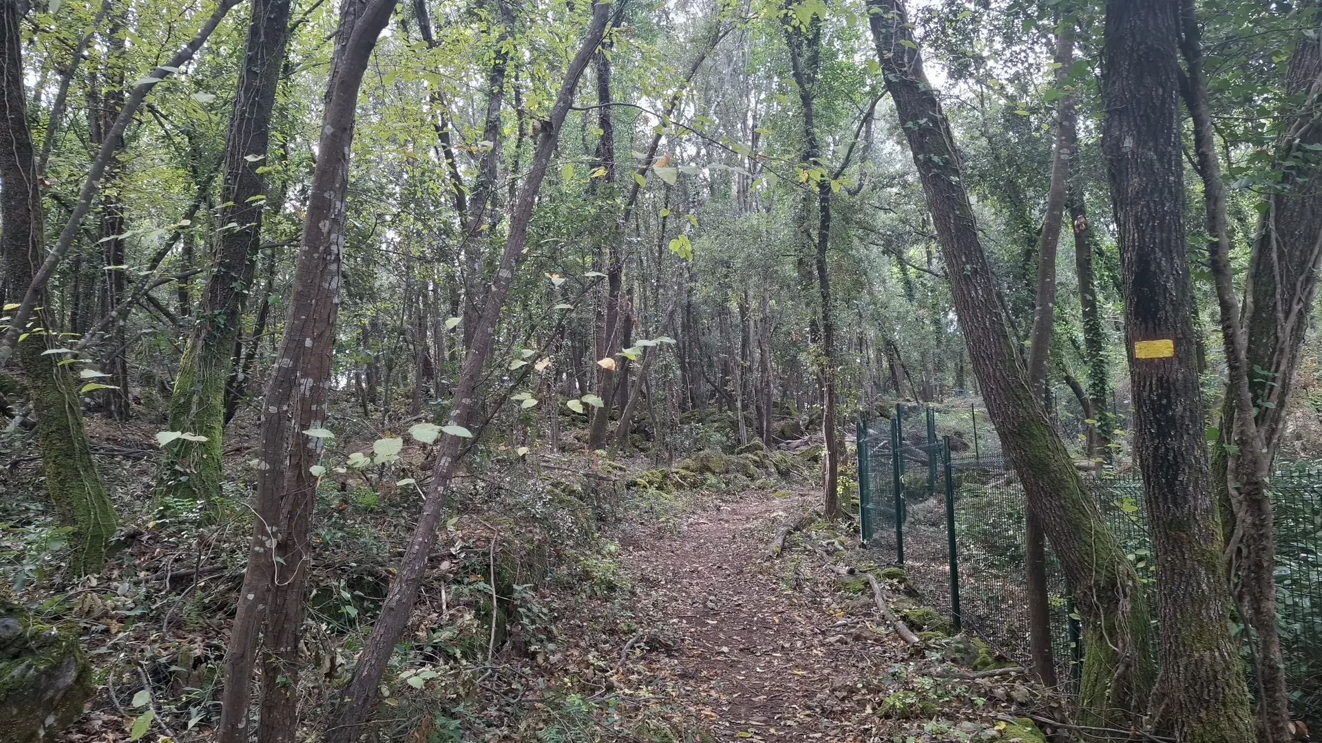 À la b.251 prendre direction les Terres Blanches (chemin du Camouyer). Tourner à gauche sur le chemin des Bertrands (b.259) et longer les restanques d’oliviers. Au plus haut du chemin, suivre le balisage jaune sur le poteau électrique, pour remonter un chemin boisé jusqu’à la piste du Débram (b.260) et tourner à gauche.