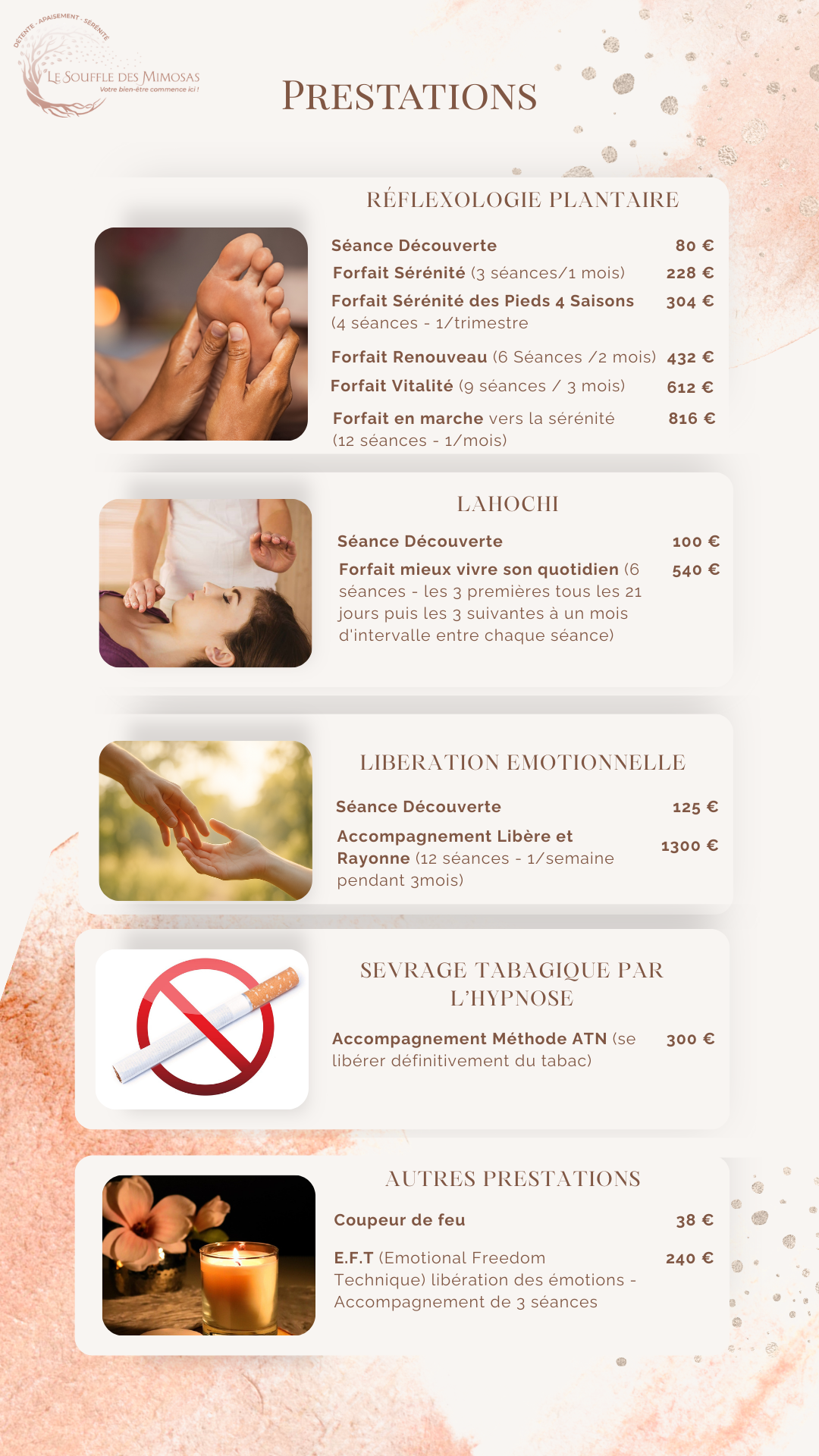 Je propose des séances de réflexologie plantaire et de LaHoChi afin de vous aider à vous détendre, à réduire le stress et à améliorer votre bien-être général.