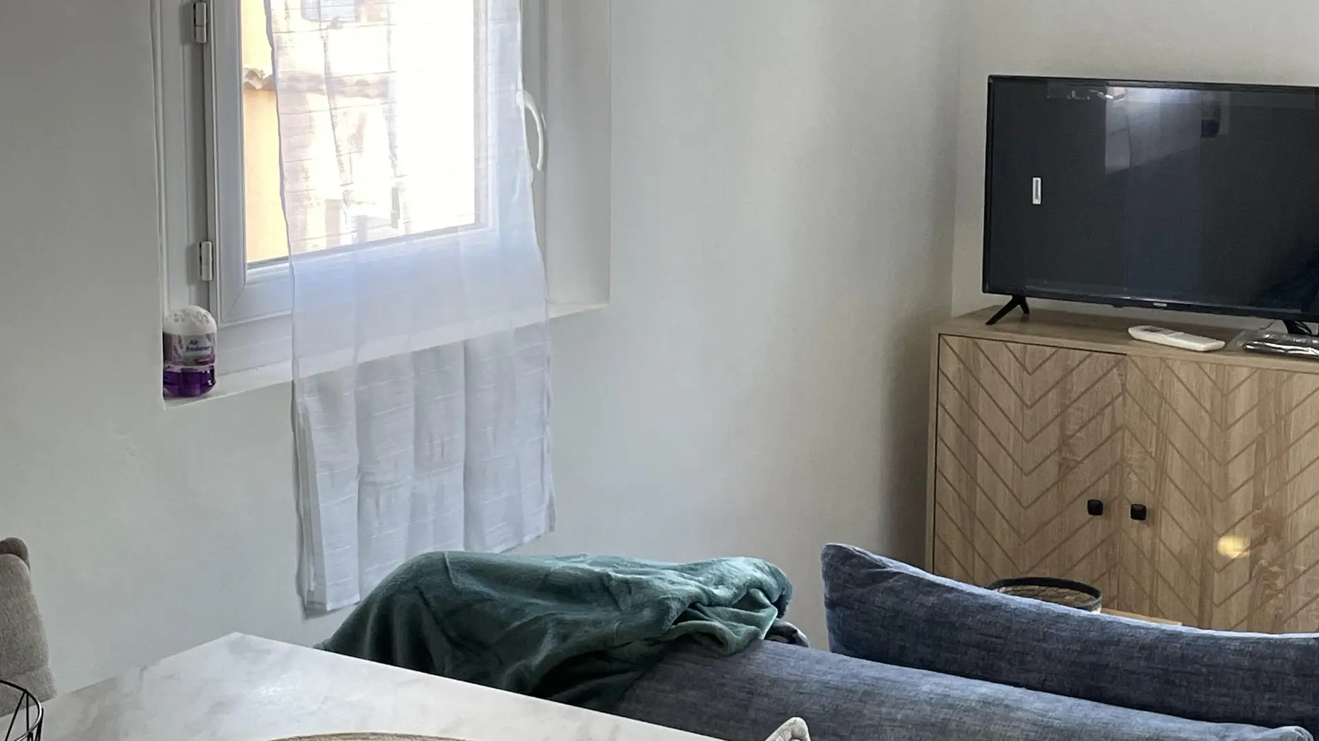 Pièce de vie climatisée avec un coin salon doté d'un canapé et d'une TV.