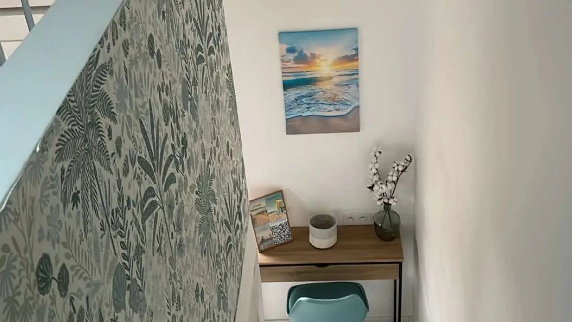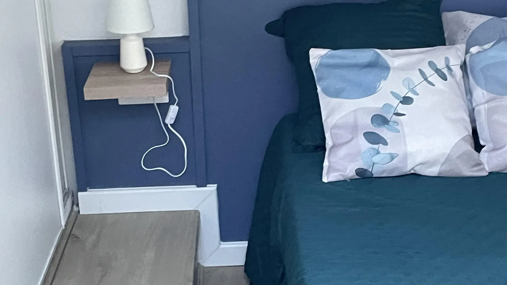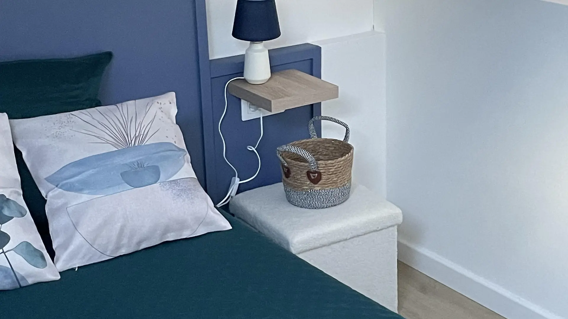 À l'étage, en mezzanine, se trouve une chambre avec un lit pour deux personnes et de grands rangements.