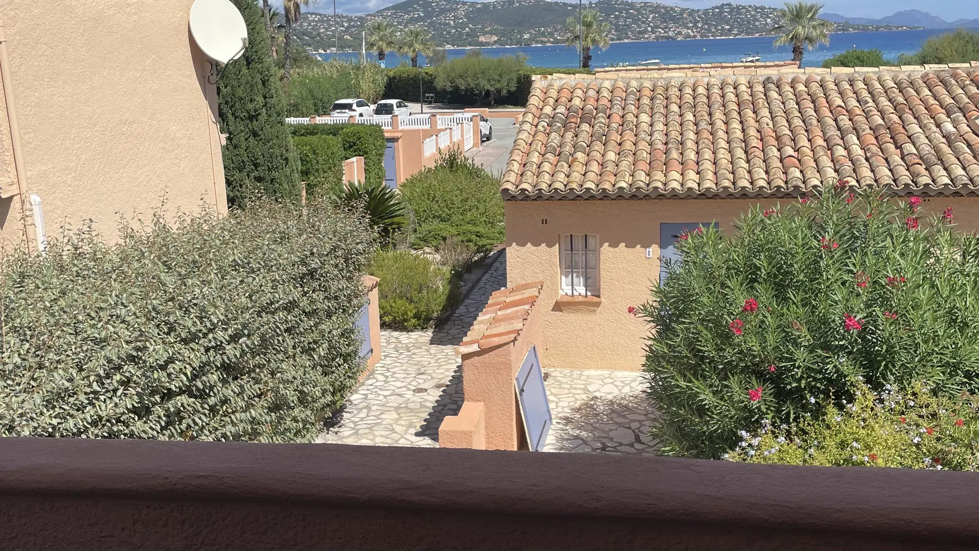 Un balcon de 5 m2 avec vue sur mer, une table et deux chaises.