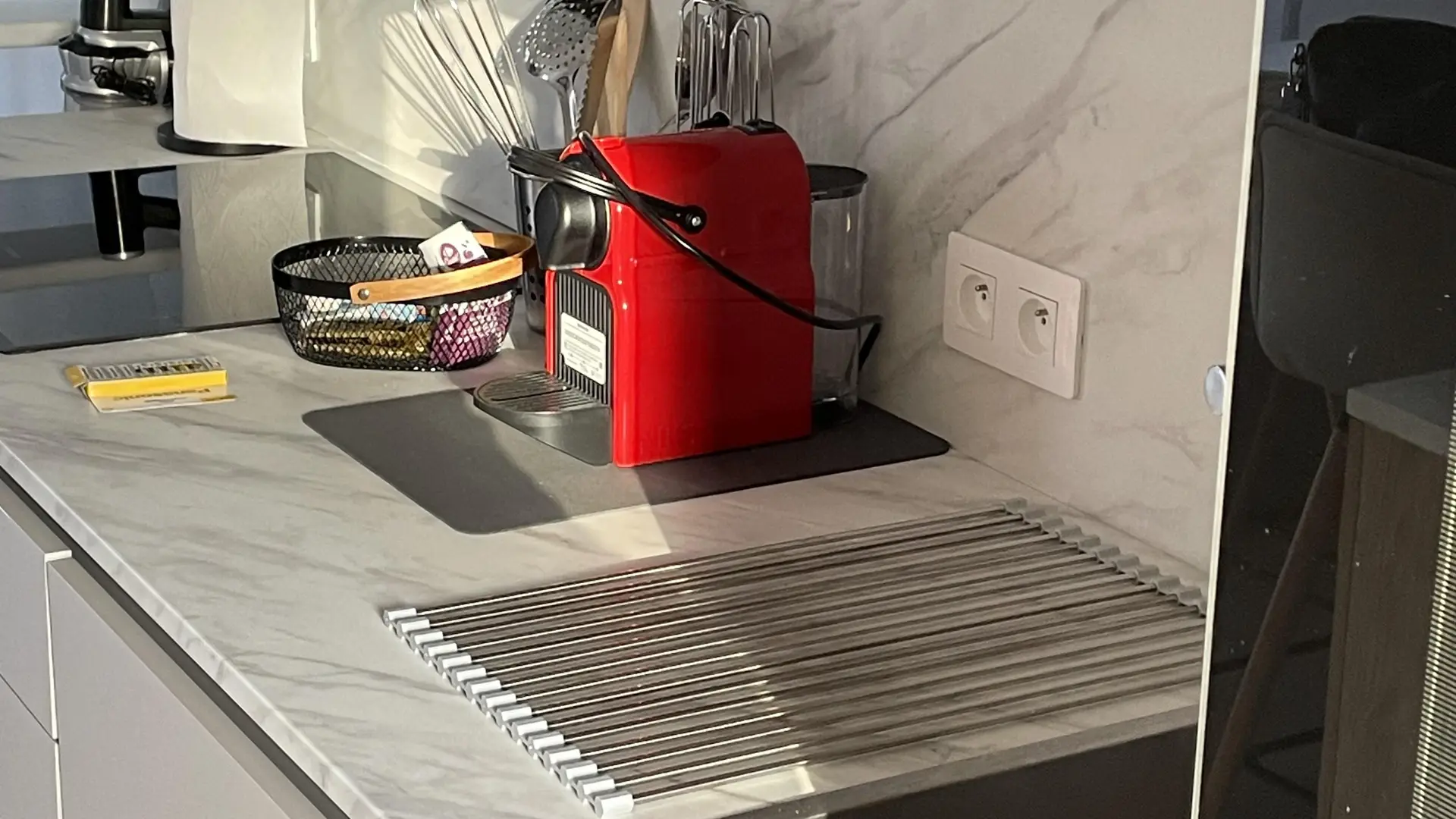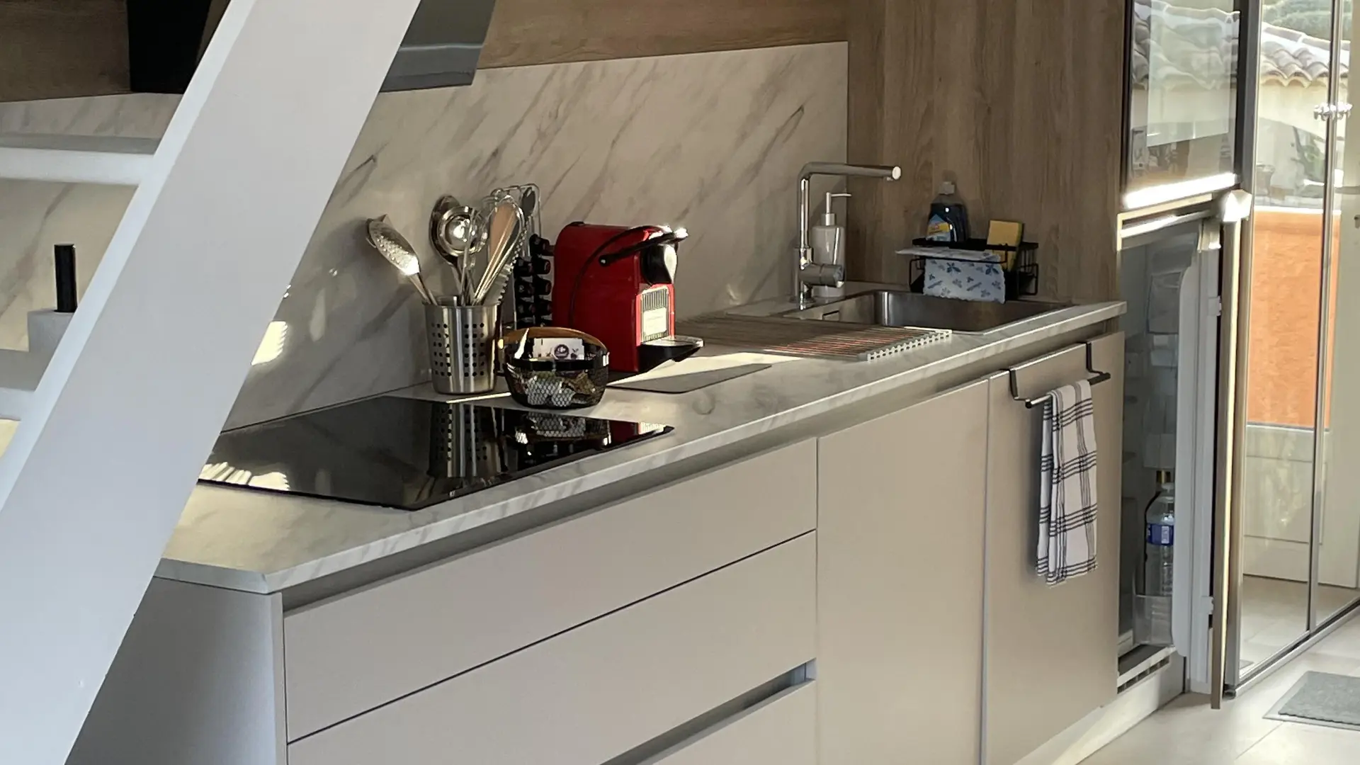 Cet appartement est composé d'une cuisine toute équipée, c'est-à-dire qu'il comprend un lave-vaisselle, un four et un micro-ondes, d'un réfrigérateur, de plaques de cuisson, d'une cafetière, d'un grille-pain, d'une bouilloire et d'une théière.