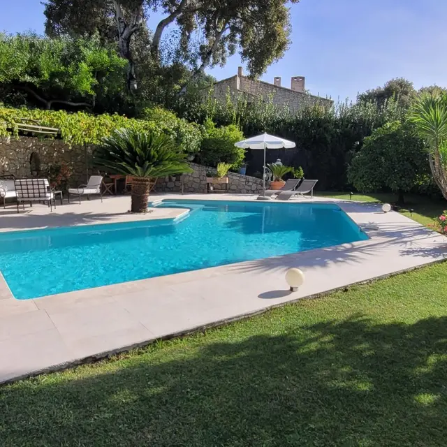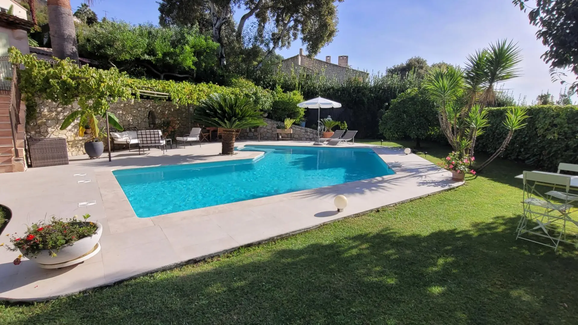 Rez de Chaussée de villa et sa grande piscine avec le Baou de Saint-Jeannet en toile de fond