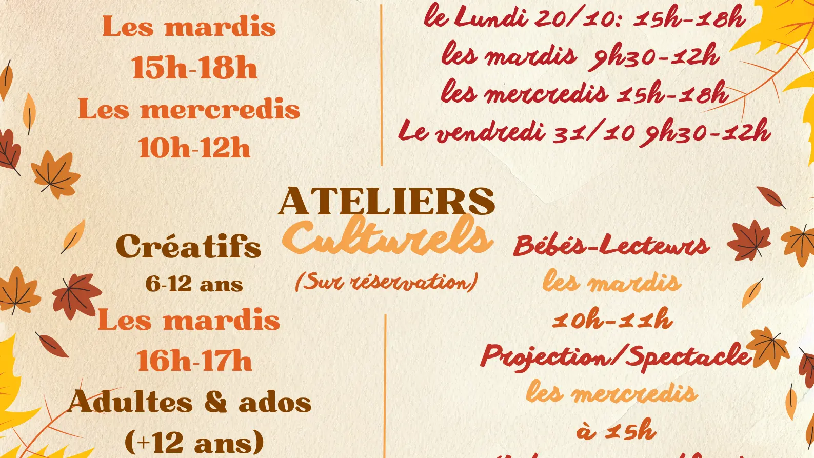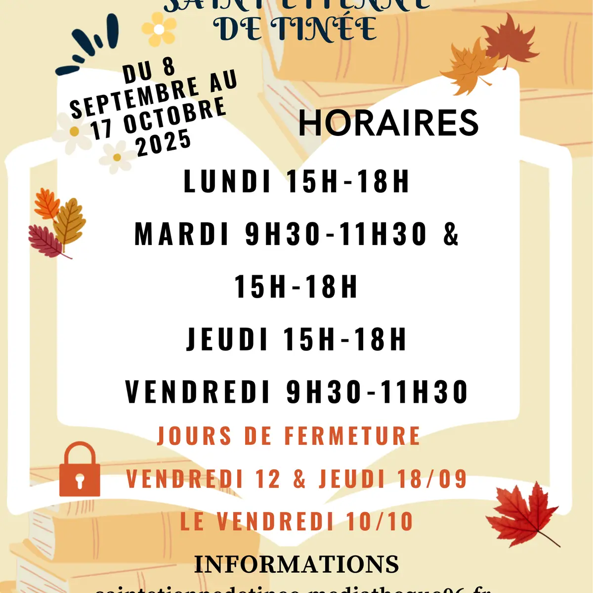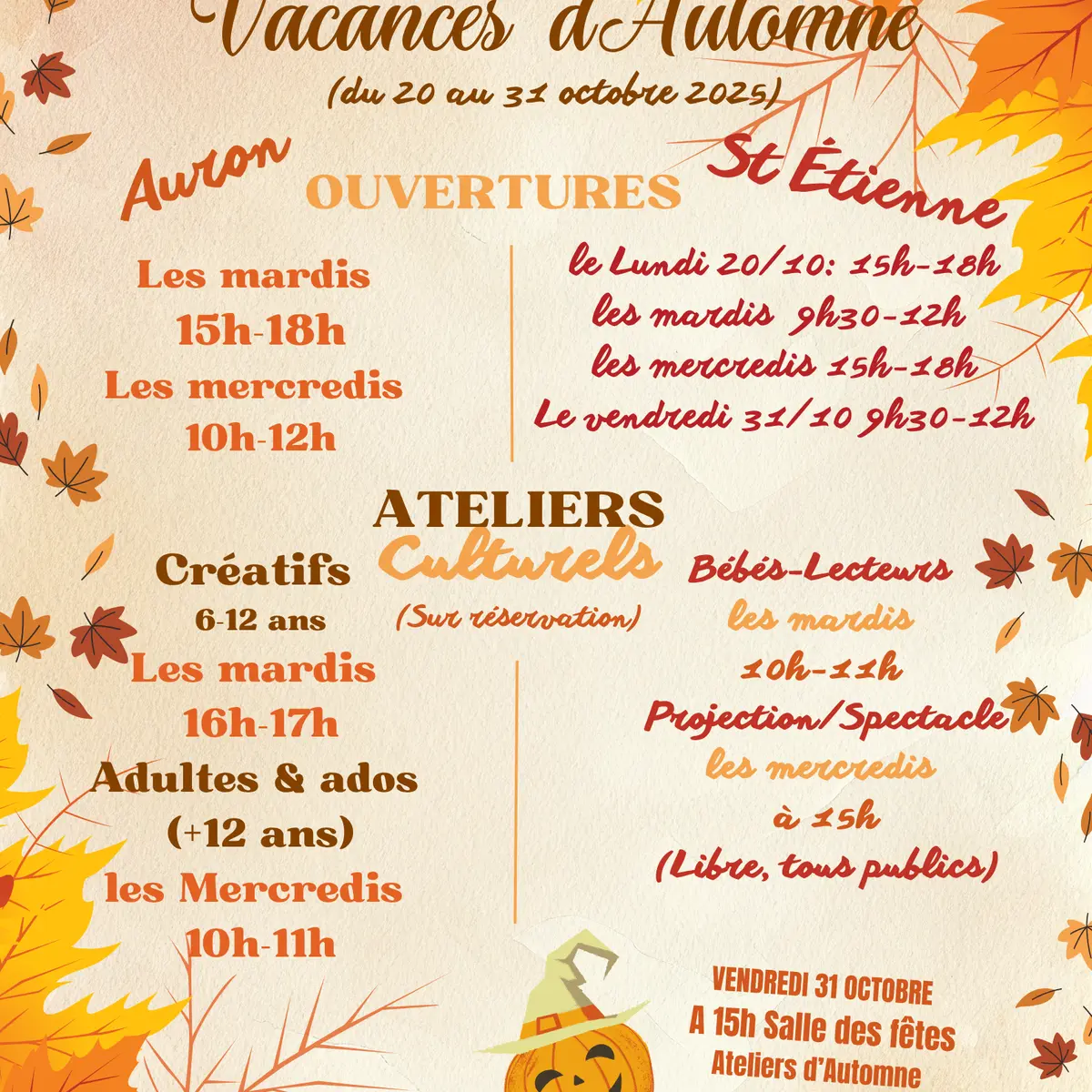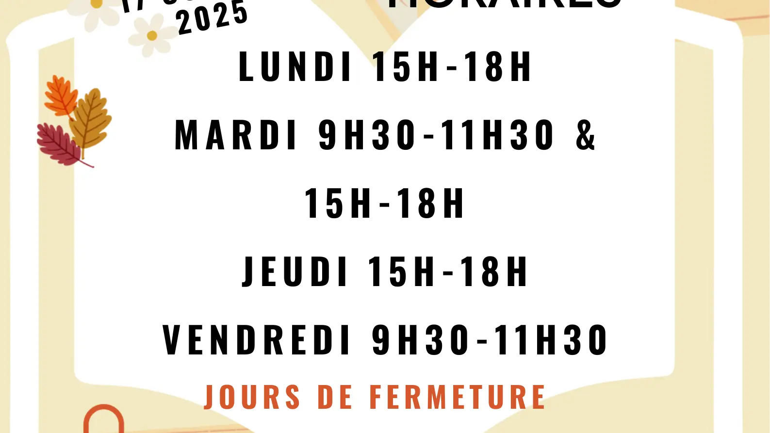 Ouvert lundi de 15h à 18h / les mardi de 9h30 à 12h / les mercredis de 15h à 18h / le vendredi 31/10 de 9h à 12h