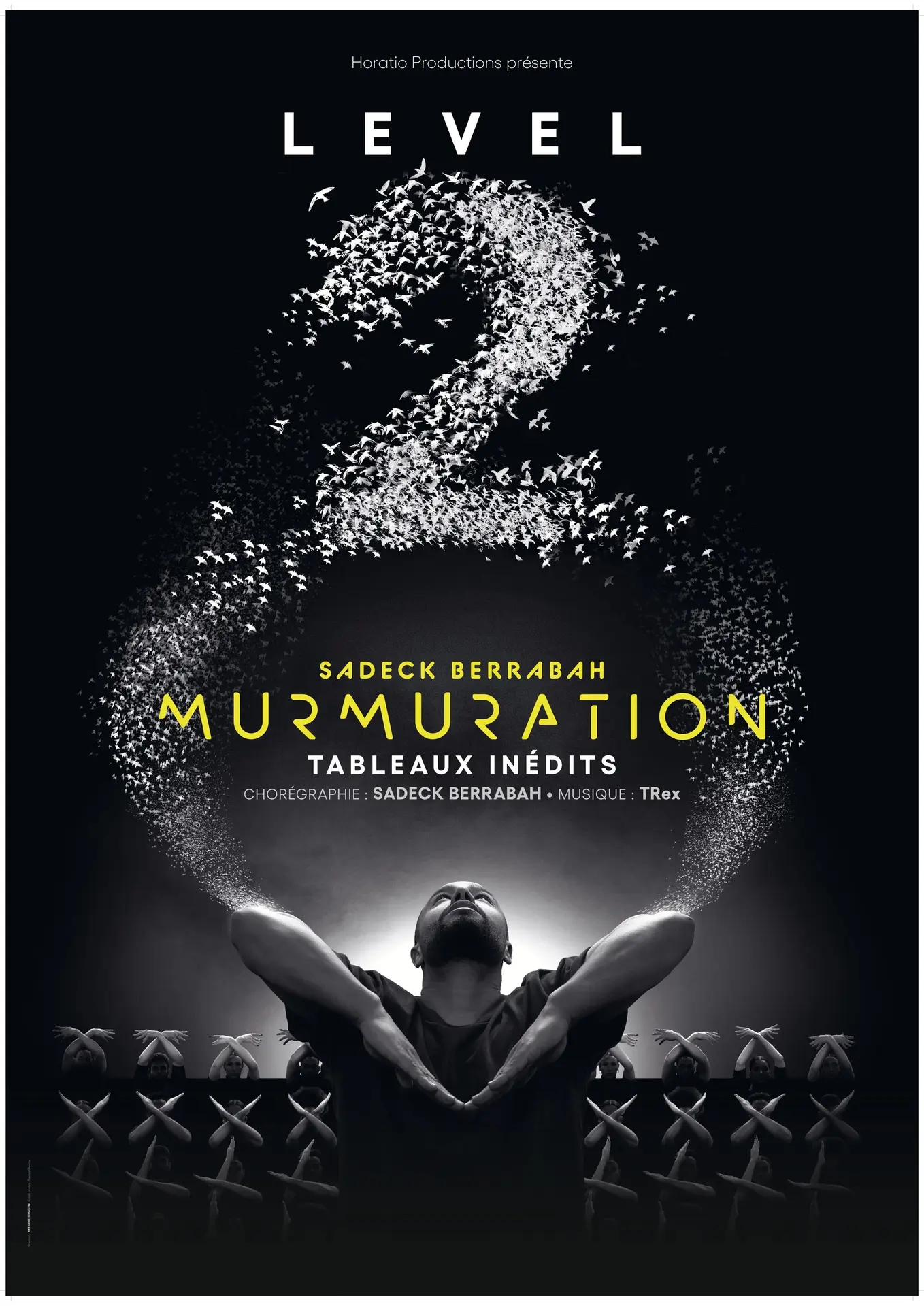 Enfant, il adorait dessiner tout comme il appréciait danser sur les vidéos de Michael Jackson. Parvenu à l’âge adulte, Sadeck Berrabah a l’idée de concilier ses passions en imaginant une forme de danse totalement inédite. Sa première création, Géométrie variable, postée sur internet, fascine et entraîne une reconnaissance immédiate de son travail. Shakira, séduite par son style, le sollicite pour la création de l’un de ses clips. Il se démarque par une orchestration des mouvements dans une recherche constante de lignes qui offrent des perspectives destinées à surprendre. D’un point de vue technique, Sadeck Barrabah s’inspire d’une gestuelle issue du hip-hop comme le popping qui se traduit par des contractions musculaires ou le tutting qui permet la formation de figures géométriques. Pour Murmuration – Level 2, la trentaine de danseurs présents sur scène évolue sur une chorégraphie d’une précision millimétrée comme guidée par une connexion les reliant les uns aux autres. Ce résultat graphique, particulièrement hypnotique, est renforcé par des effets lumineux qui viennent souligner la qualité des ensembles en leur conférant une poésie réinventée. CHORÉGRAPHIE - Sadeck Berrabah MUSIQUE - TRex Avec 30 danseurs RESMUSICA : On est toujours bluffé par l'incroyable synchronicité des danseurs présents sur scène. CULT.NEWS : Un voyage hypnotique saisissant. AU BALCON : Un concept unique de connexion et de partage avec plus de 30 danseurs sur scène, des images saisissantes, une musique envoutante et la synchronisation parfaite des danseurs rendent ce spectacle unique au monde. HORATIO PRODUCTIONS