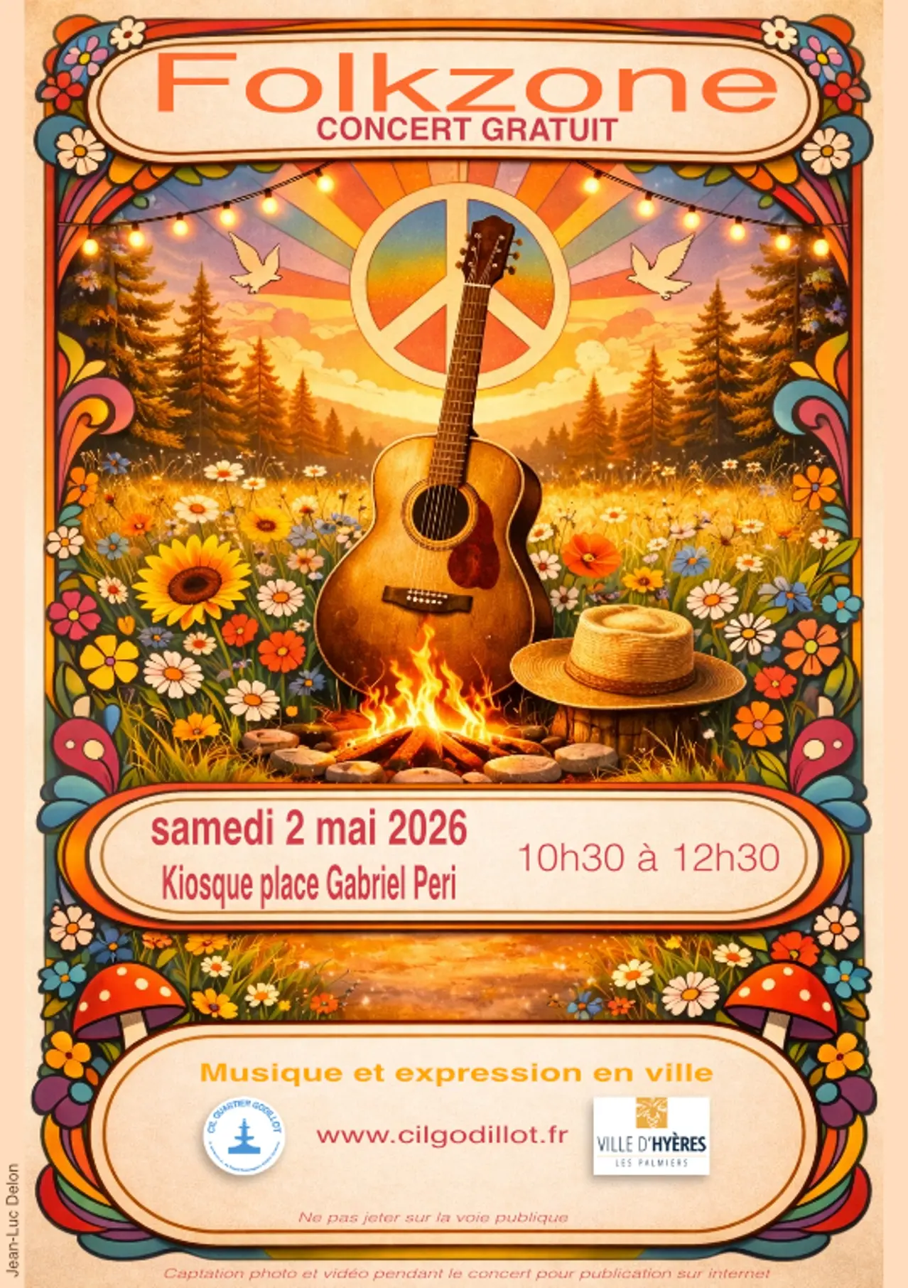 Le CIL Godillot a invité, pour la première fois, le groupe Folkzone qui interprètera des morceaux Pop, Rock, Folk et de variété le samedi 2 mai 2026. Venez écouter Neil Young, Cat Stivens, América, Capdevielle de 10h30 à 12h30 au kiosque de la place Gabriel Péri, avenue des Îles d'Or - Concert gratuit