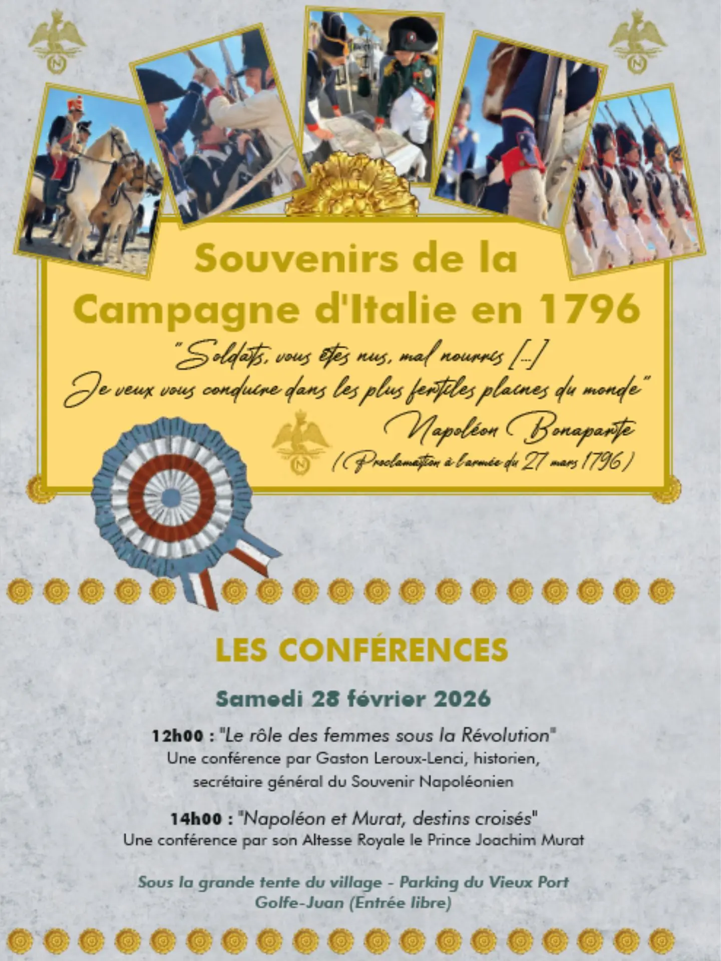 Une grande manifestation historique sur le thème du premier Empire, en mémoire du débarquement de l'empereur Napoléon 1er à Golfe-Juan en 1815. Reconstitution du débarquement, batailles, défilés en ville, conférences, village Impérial, animations…