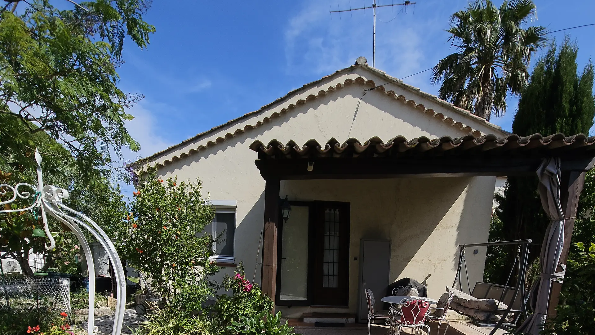 Pavillon indépendant entouré d'un jardin et d'une terrasse couverte avec table et chaises, balancelle, barbecue et cuisine équipée.