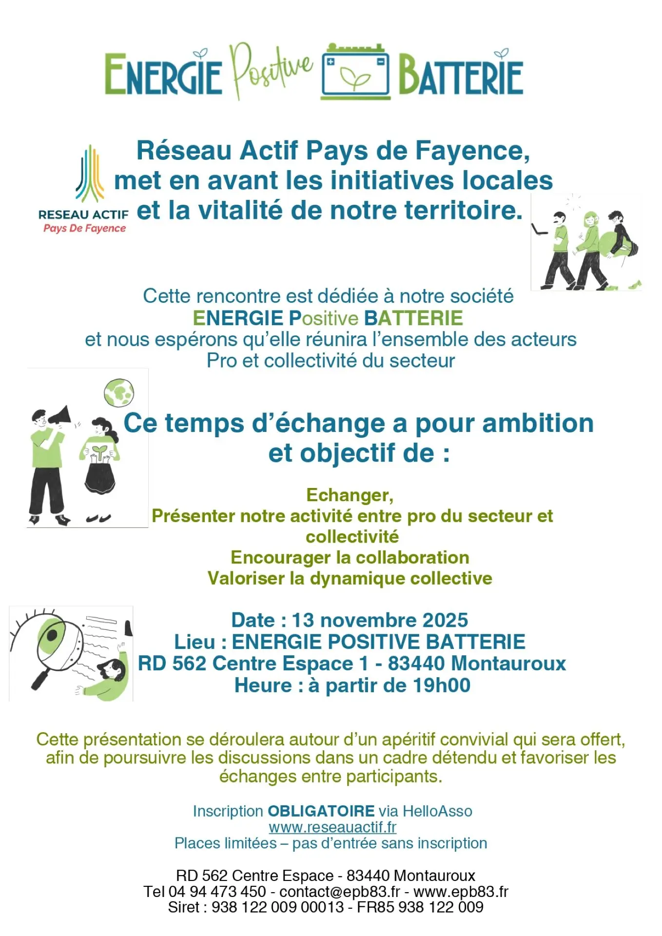Ce temps d’échange a pour ambition et objectif de réunir l’ensemble des acteurs pros et collectivités du secteur pour échanger et présenter l'activité de la société Energie Positive Batterie, encourager la collaboration et valoriser la dynamique collective.