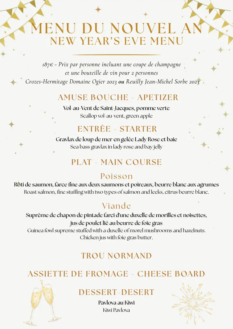 Venez passez votre soirée du Nouvel An au Bistrot Gourmand. Au menu, amuse bouche, gravlax de loup de mer en gelée, rôti de saumon, suprême de chapon, de pintade farci, trou normand, assiette de fromage et dessert.