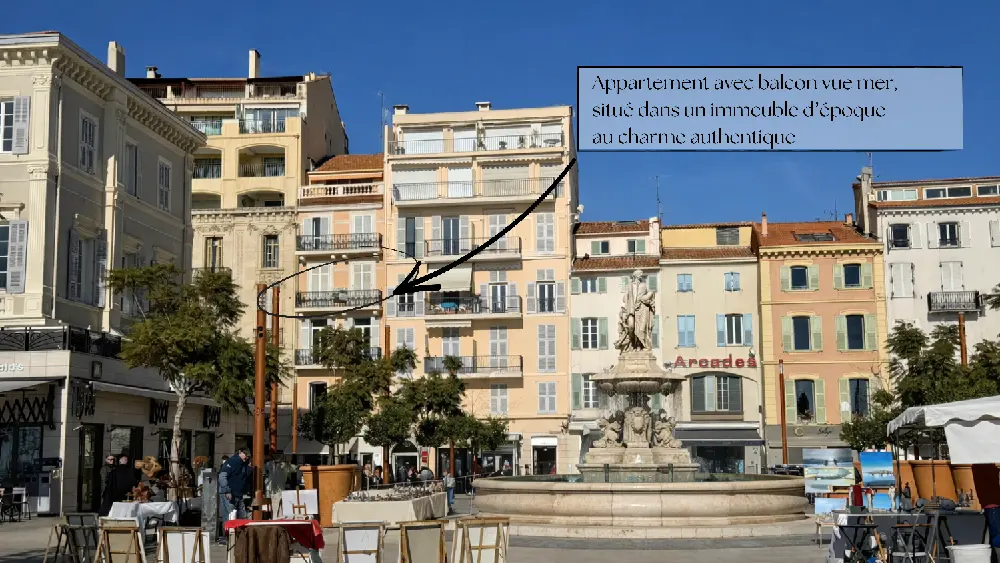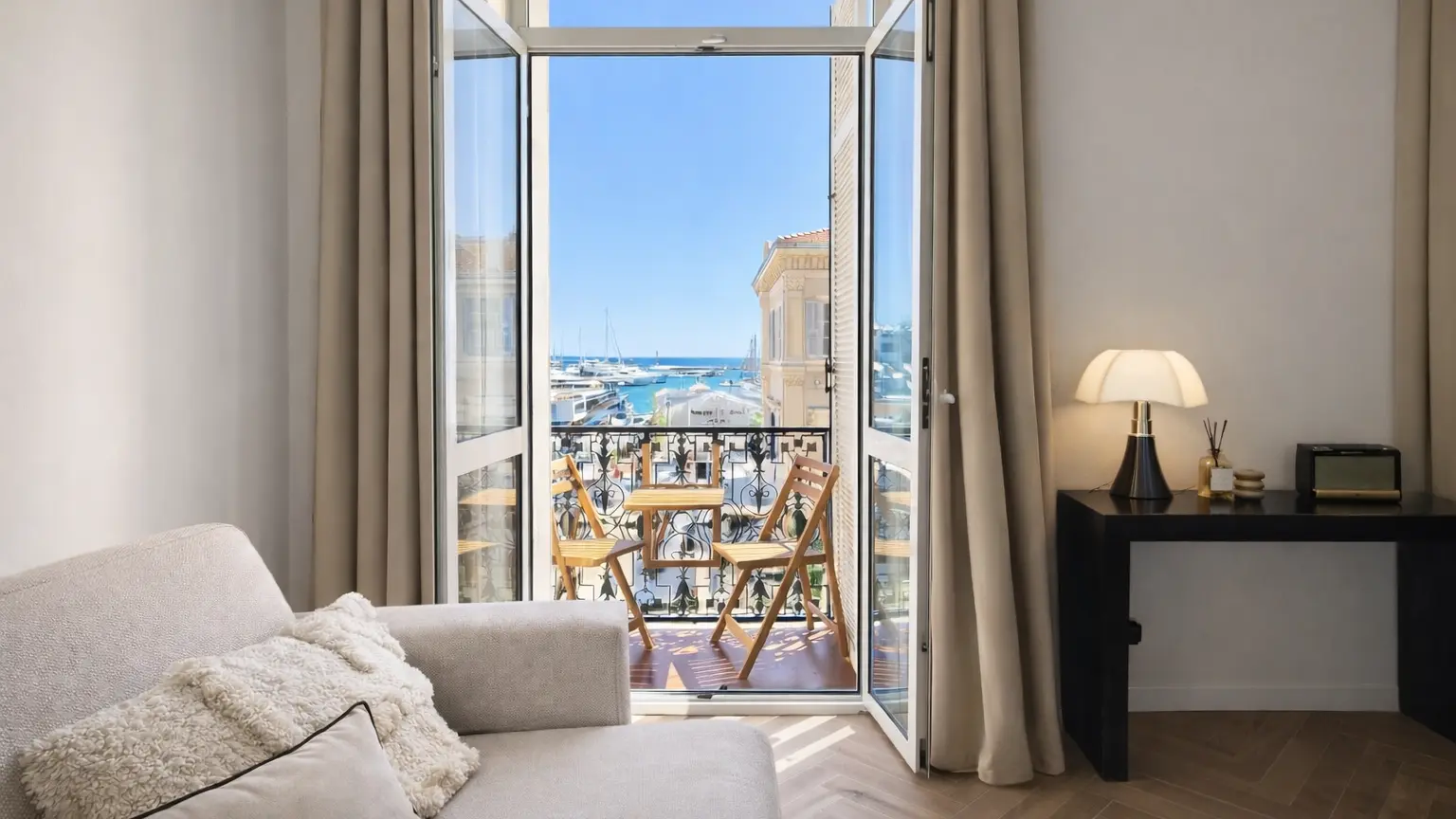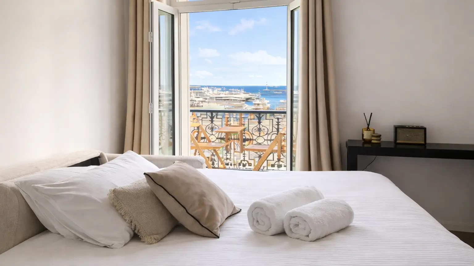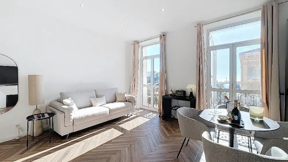 • Grand séjour avec vue époustoufflante sur le port de Cannes, la citadelle et la célèbre rue Felix Faure.