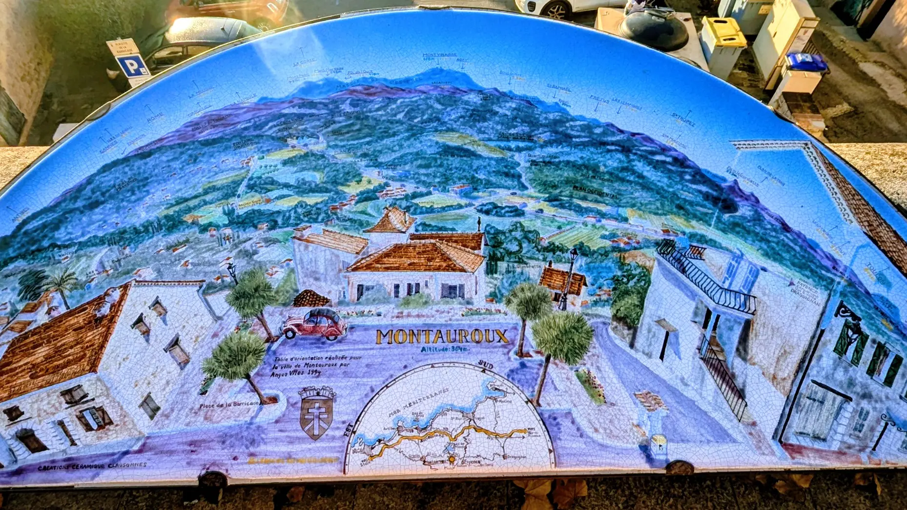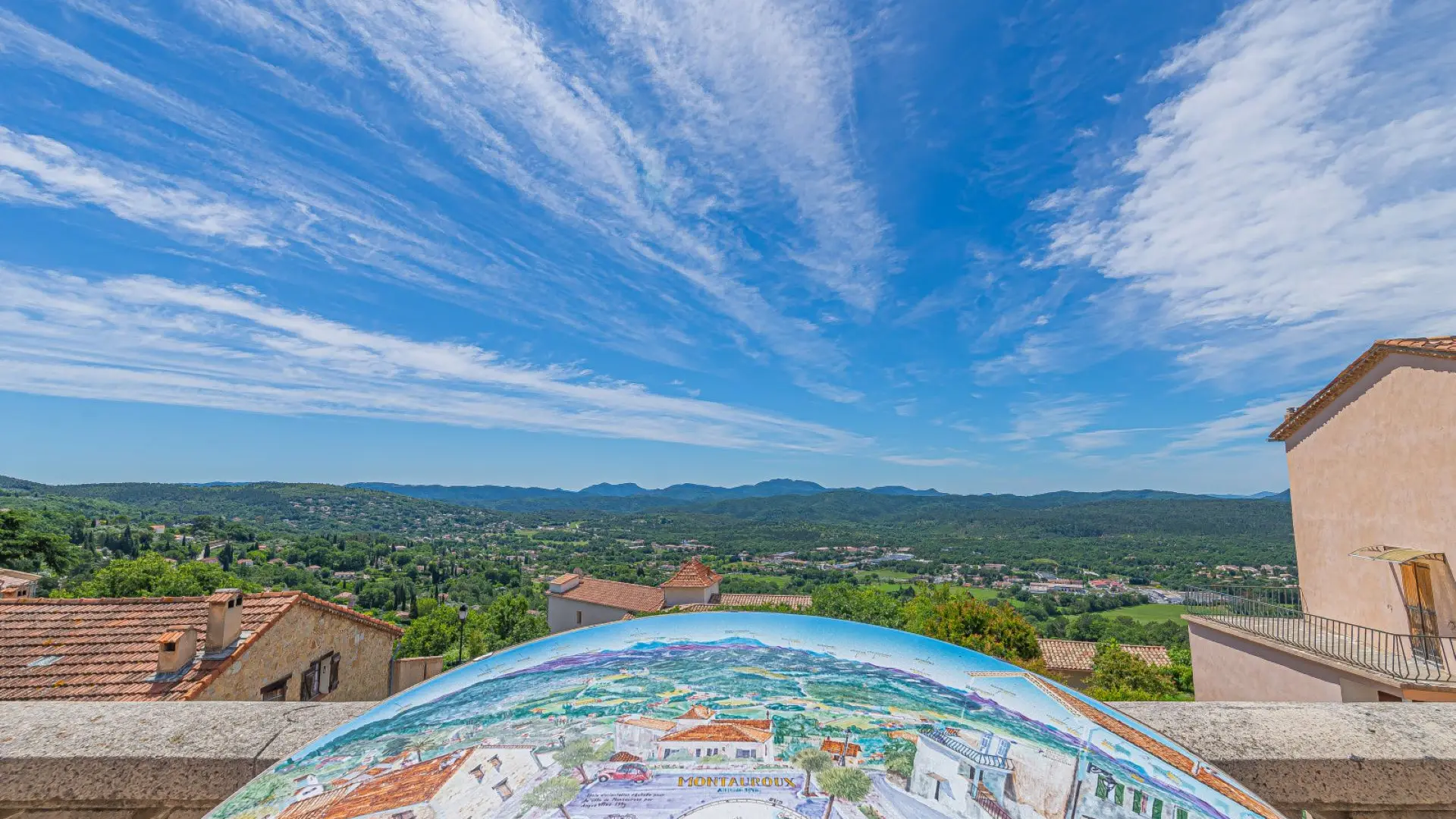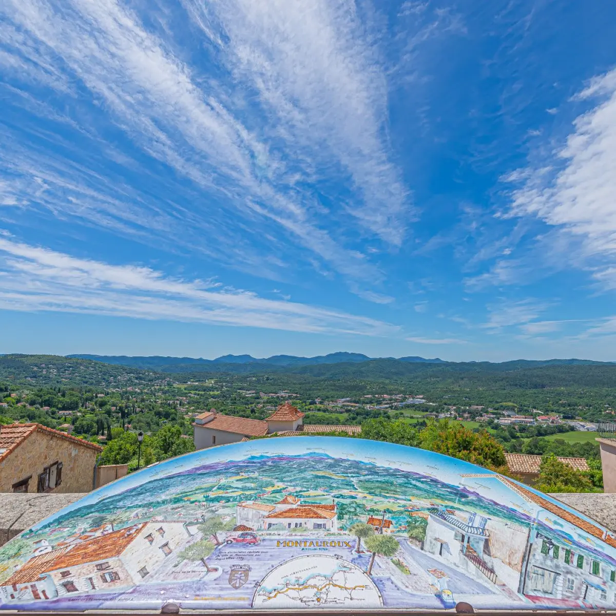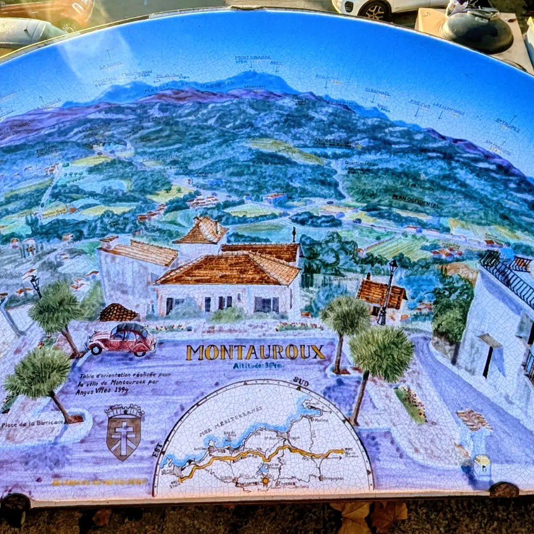 Côté sud, une table d'orientation en pierre lavée créée par Angus Viles, située à côté de l'office de tourisme, vous explique le relief qui s'offre à vos yeux, un panorama à 180° allant du massif du Tanneron, aux roches rouges de l'Estérel, le Rocher de Roquebrune et les contreforts du massif des Maures.
