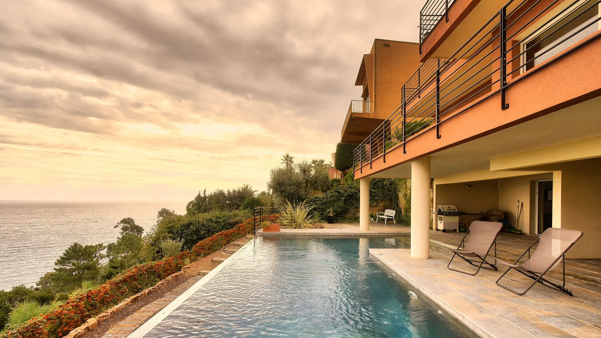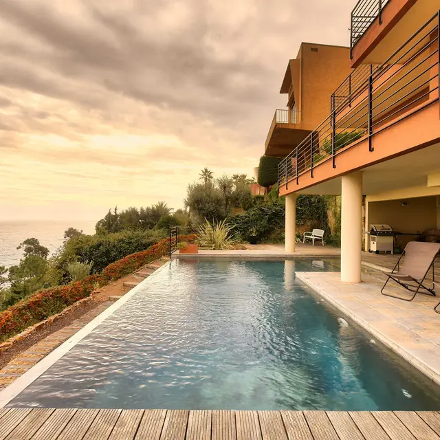 Villa contemporaine avec vue imprenable sur la mer et les îles de Lérins. A 15 km à l'ouest de Cannes. Cette maison individuelle de quatre chambres, située à côté du célèbre Palais Bulles de Pierre Cardin, offre un espace de vie et de divertissement exceptionnel sur quatre étages, des chambres aux dimensions généreuses, un ascenseur privé et une piscine chauffée à débordement.