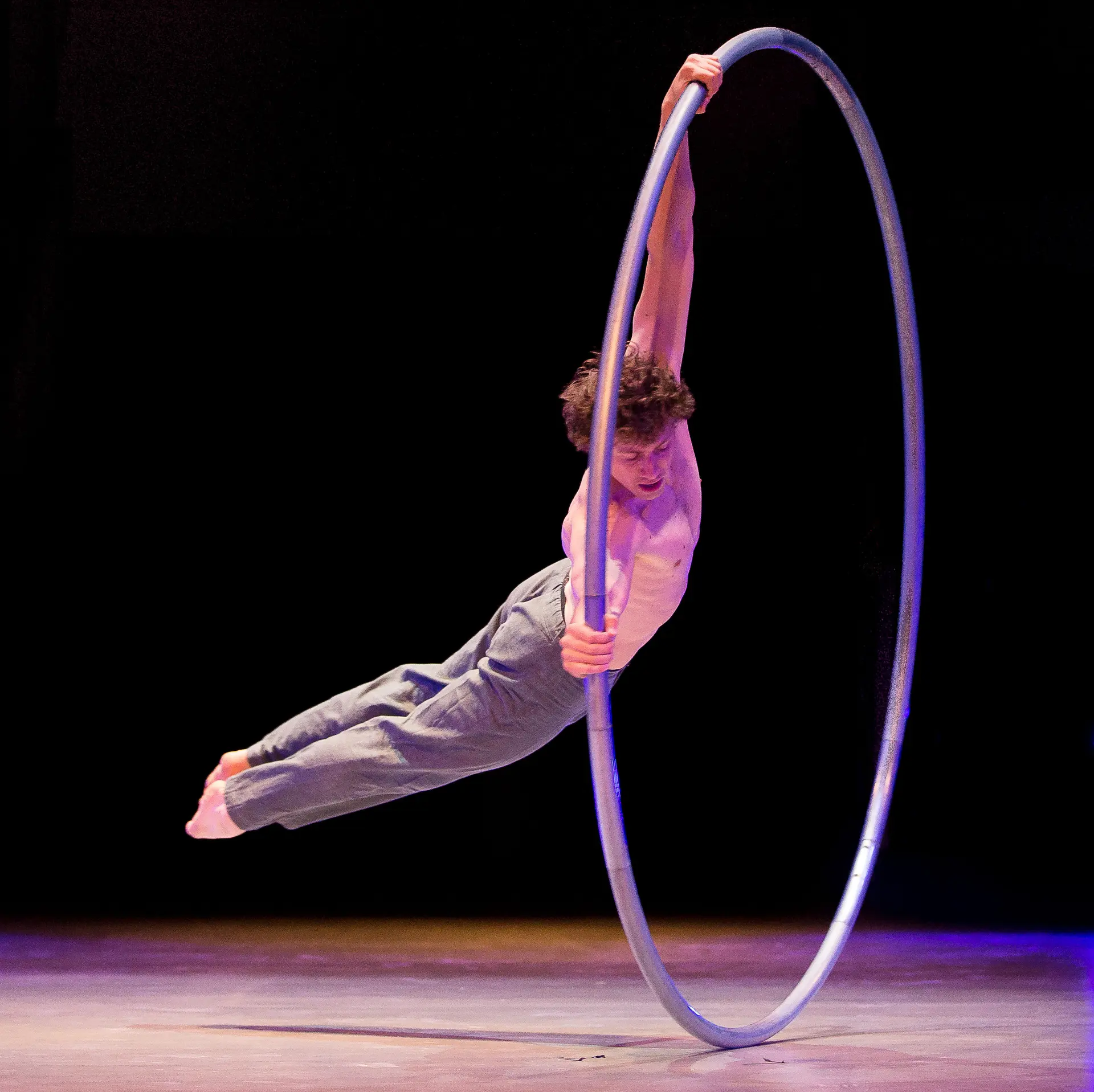 On l’appelle roue Cyr, ou cercle acrobatique. En quelques années, ce mince agrès circulaire est devenu l’instrument privilégié du circassien Théo Touvet. Qu’il le traverse d’un bond ou se cale, pieds et mains en diagonale, pour une série de tournoiements vertigineux, ce ‘plus qu’accessoire’ est au cœur de son travail et de sa création. L’artiste et chercheur, fasciné par la pesanteur, en joue en virtuose.