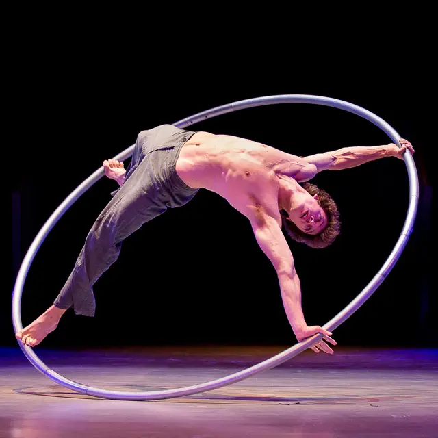 On l’appelle roue Cyr, ou cercle acrobatique. En quelques années, ce mince agrès circulaire est devenu l’instrument privilégié du circassien Théo Touvet. Qu’il le traverse d’un bond ou se cale, pieds et mains en diagonale, pour une série de tournoiements vertigineux, ce ‘plus qu’accessoire’ est au cœur de son travail et de sa création. L’artiste et chercheur, fasciné par la pesanteur, en joue en virtuose.