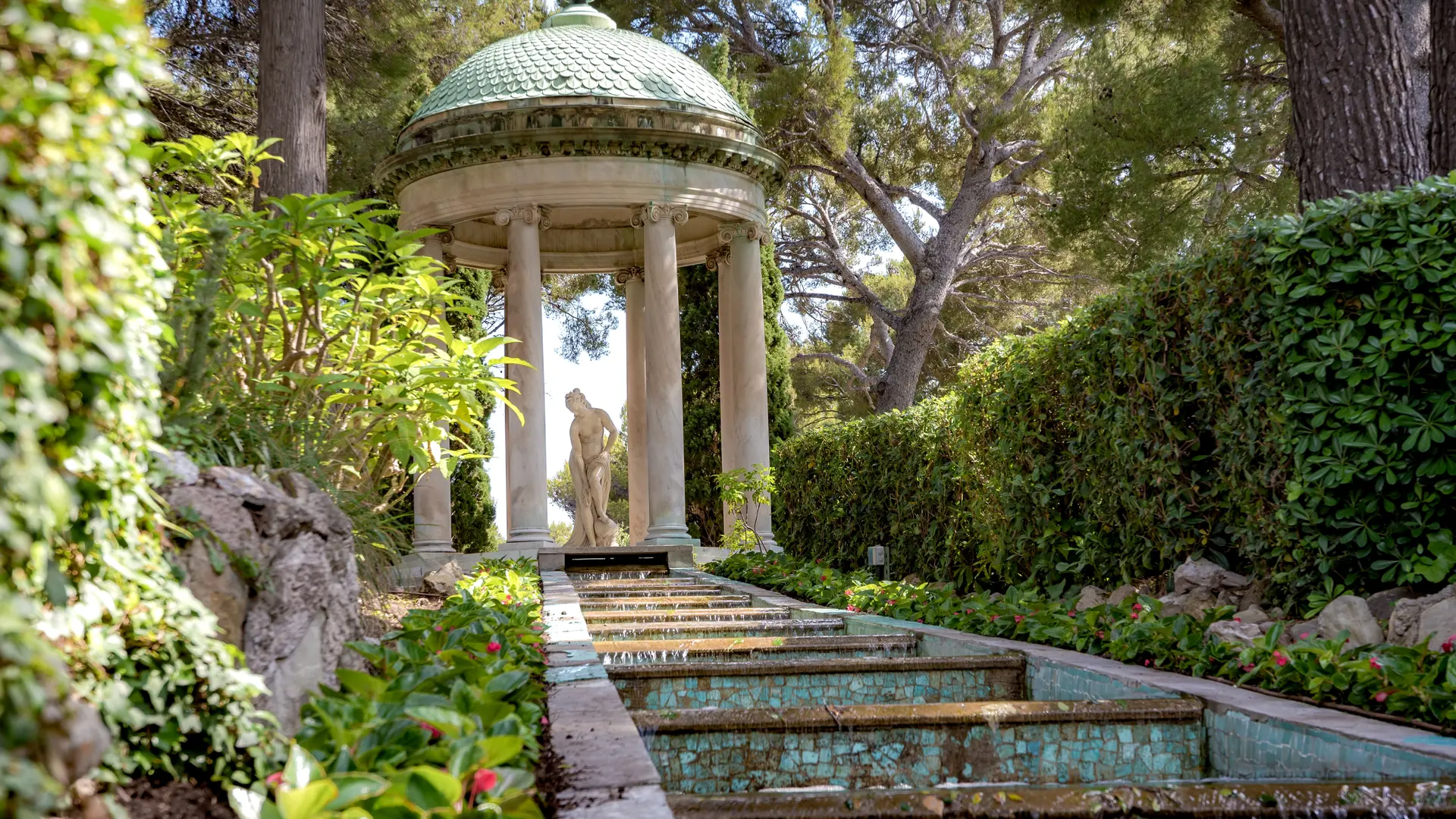 Parcourez les 9 jardins ornés de colonnades, cascades, bassins, parterres fleuris et arbres aux essences rares : jardins espagnol, florentin, lapidaire, japonais, exotique, roseraie, provençal, à la française et jardin de Sèvres.