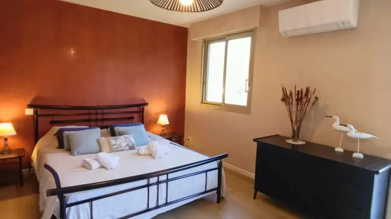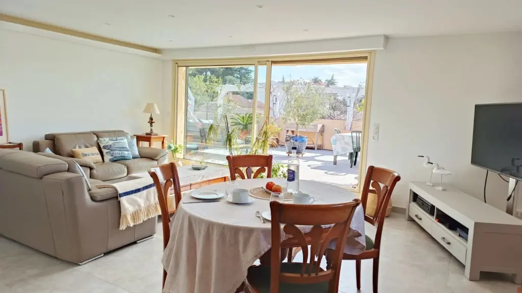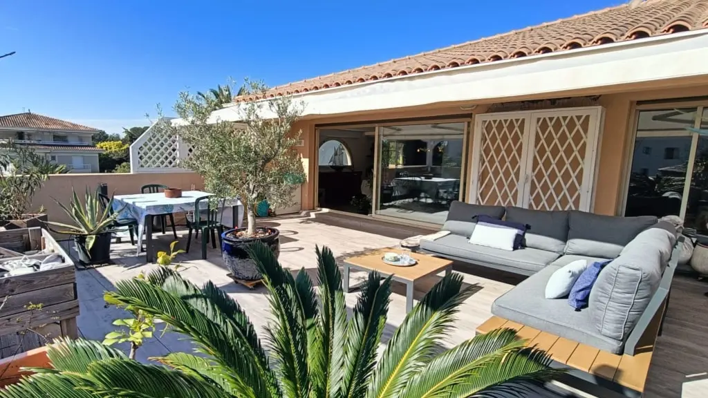 Ce magnifique bien est situé en plein cœur du quartier balnéaire très prisé de Boulouris. Les commerces de bouche, et autres se trouvent à moins de 5mn à pied du centre-ville près de la gare SNCF de Boulouris-sur-Mer. L'appartement climatisé, bénéficie d'une très belle terrasse arborée de 50 m² exposée plein sud avec vue dégagée et verdoyante. Doté d’une vaste pièce à vivre, d'une superbe cuisine américaine (plaque induction 4 feux, four, micro-ondes multifonctions, frigo américain, congélateur), L'appartement dispose de deux salles d'eau (avec douche et WC) dont une comprise dans la suite parentale avec un large lit « Queen size », d'une chambre avec 3 lits simples avec accès à un balcon. Table de repas et salon de jardin complètent le bien pour des vacances simplement délicieuses. Machine à laver et sèche-linge, vaisselle de qualité, Wifi et stationnement privatif.