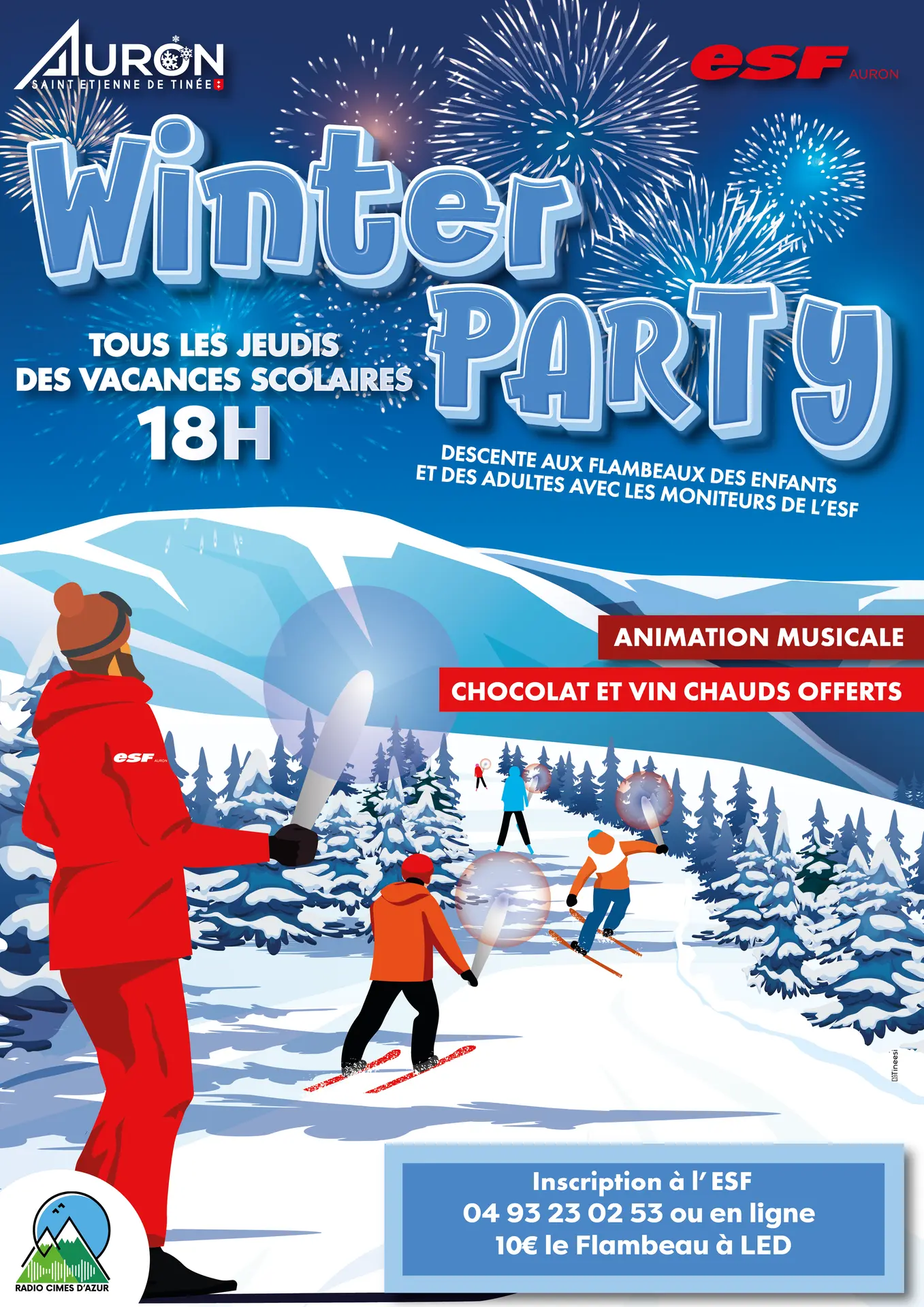 Descente à ski aux flambeaux des enfants (niveau flocon) et animation musicale avec les moniteurs de ski de l'ESF d'Auron dès 18h. Piste du Riou ou sur traversée 2000/vallons/nabines. Accessible aux skieurs et piétons. Boissons chaudes.